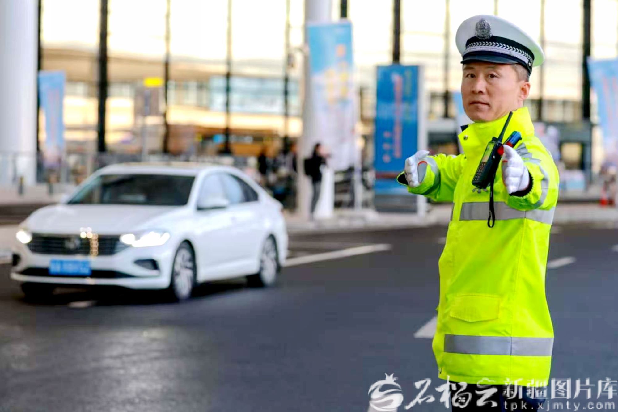 10月22日,乌鲁木齐天山国际机场航站楼前,交警现场指挥交通,保障通行顺畅。郑翔璐摄