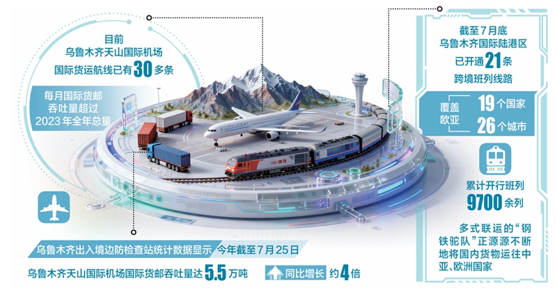 目前,乌鲁木齐天山国际机场国际货运航线已有30多条,每月国际货邮吞吐量均超2023年全年总量;今年7月27日开通的乌鲁木齐—巴黎/马德里货运航线,为中国西部与欧洲核心市场首次建立常态化航空货运纽带,对深化中欧经贸合作具有重要现实意义。