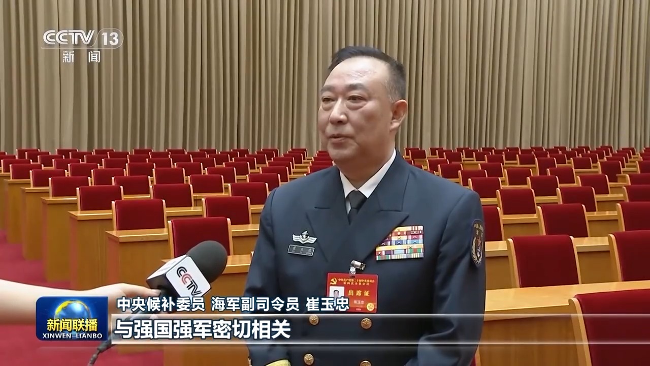 中央候补委员、海军副司令员 崔玉忠:这次全会上,习主席代表中央政治局所作的工作报告,总结工作系统全面,部署任务重点突出。海军是战略性军种,与强国强军密切相关,我们一定坚决贯彻党中央、习主席决策部署,紧扣百年目标,瞄准世界一流,全面提升海上威慑和实战能力,不断开创海军现代化建设的新局面,以优异成绩向党中央、习主席交出合格答卷。
