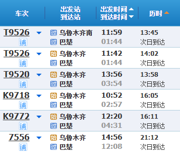 乌鲁木齐至巴楚列车时刻。
