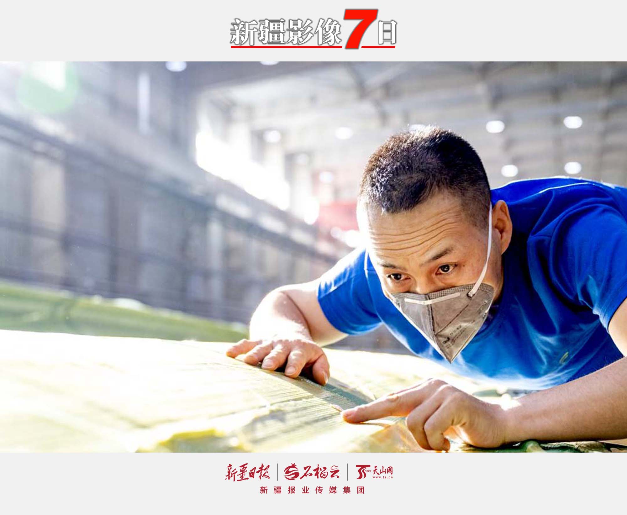 10月21日,昌吉国家高新技术产业开发区新疆成飞新材料有限公司风电叶片生产基地,工作人员在生产风力发电机组叶片。该企业今年已累计生产风力发电机组叶片200余套,预计产值突破6亿元。何龙 摄