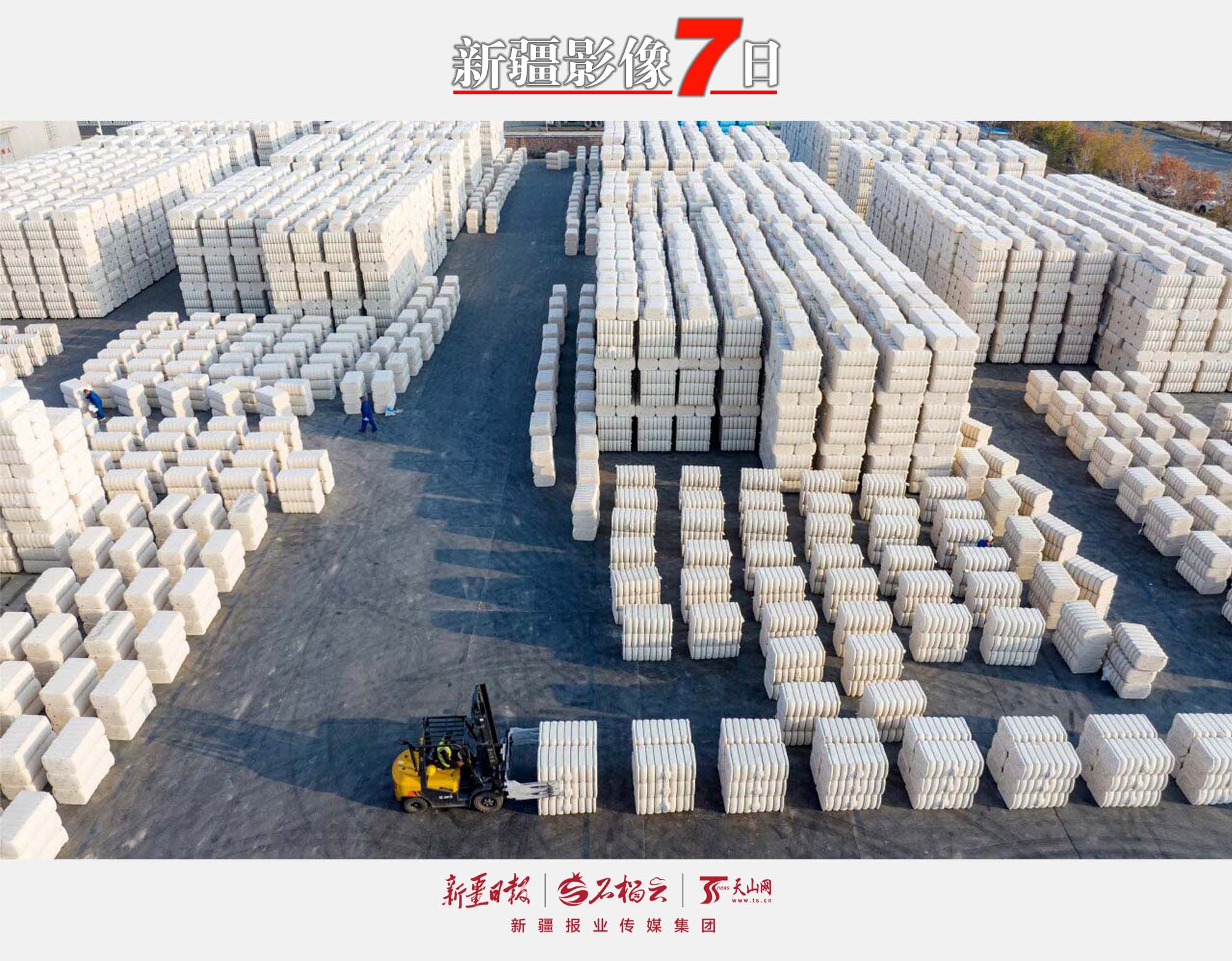 10月21日,新疆昌吉市华嵘电子商务有限责任公司华宏棉花专业监管仓库,工作人员正在转运棉包。眼下正值皮棉调运交割高峰期,昌吉回族自治州各棉花加工企业加紧将皮棉转入专业监管仓库。何龙 摄