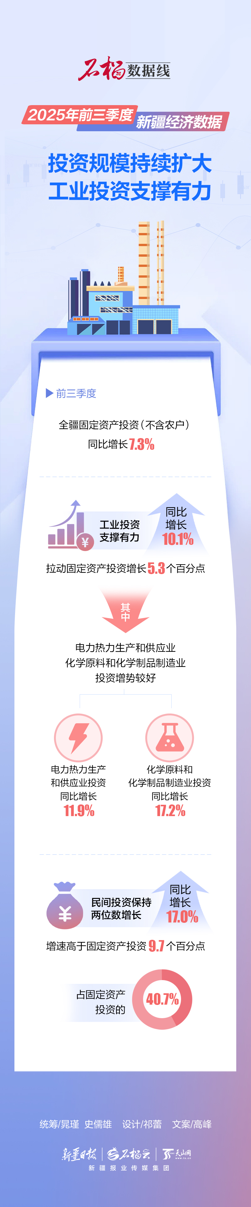 2025年前三季度,全疆固定资产投资(不含农户)同比增长7.3%。