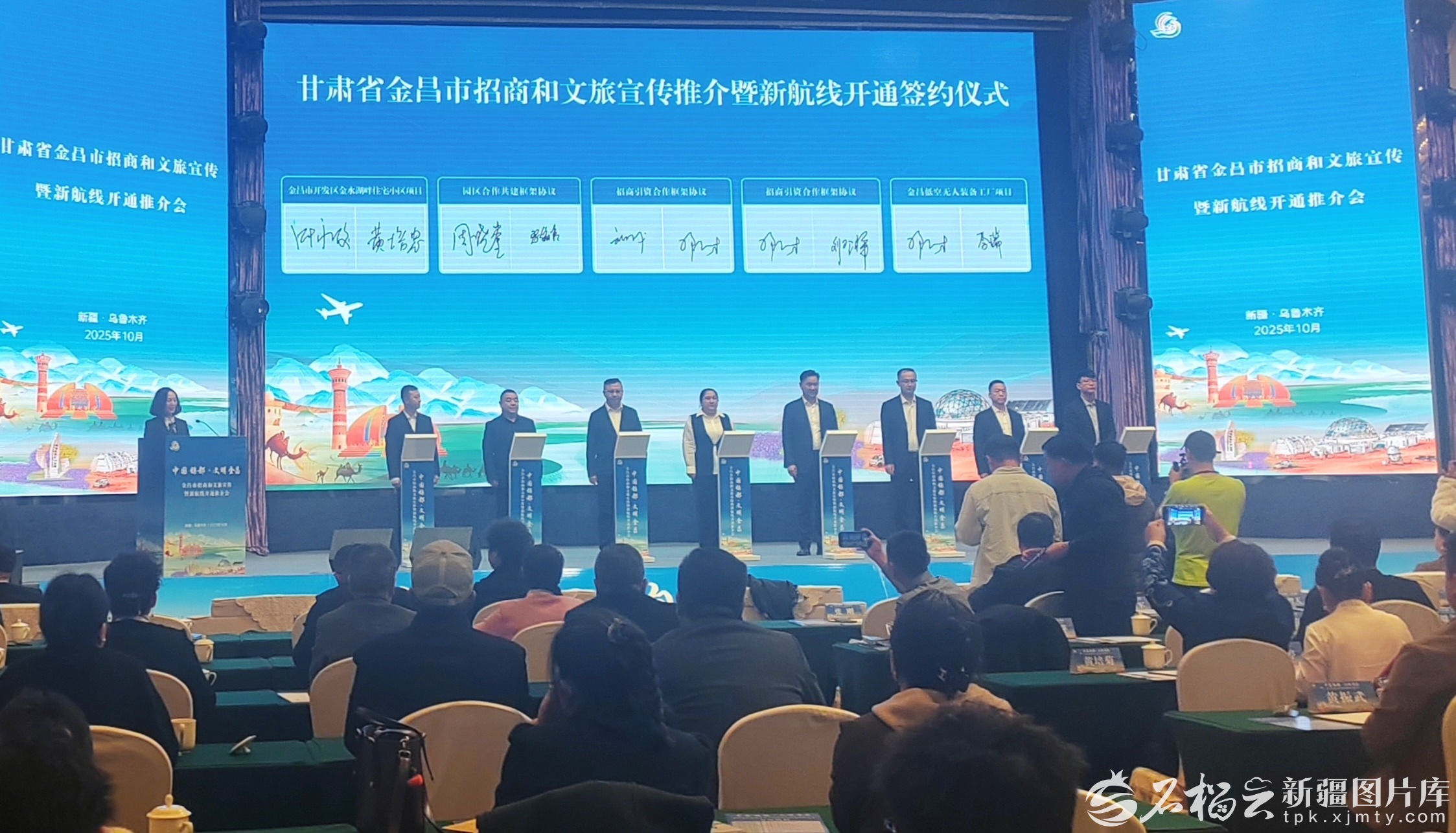 当天推介会上,金昌市重点展示了其“硬核”工业实力与“柔美”文旅内涵。金昌市招商局详细介绍了有色金属新材料、新能源等“2+4”产业集群的发展机遇;文旅推介则带大家领略了从“火星1号基地”的科幻体验到紫金花海的戈壁浪漫,展现了金昌多元的城市魅力。此外,金昌市与新疆甘肃商会、兵团商会、多家文旅企业及民航单位达成合作协议,签约内容涵盖文旅合作、航线运营及低空经济、园区共建、住宅开发等多个领域项目,标志着两地合作迈进新的阶段。