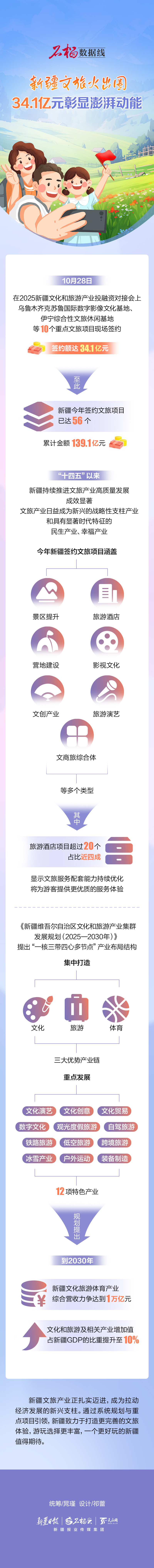 10月28日,在2025新疆文化和旅游产业投融资对接会上,乌鲁木齐克苏鲁国际数字影像文化基地、伊宁综合性文旅休闲基地等10个重点文旅项目现场签约,签约额达34.1亿元。至此,全区今年签约文旅项目已达56个,累计金额139.1亿元。
