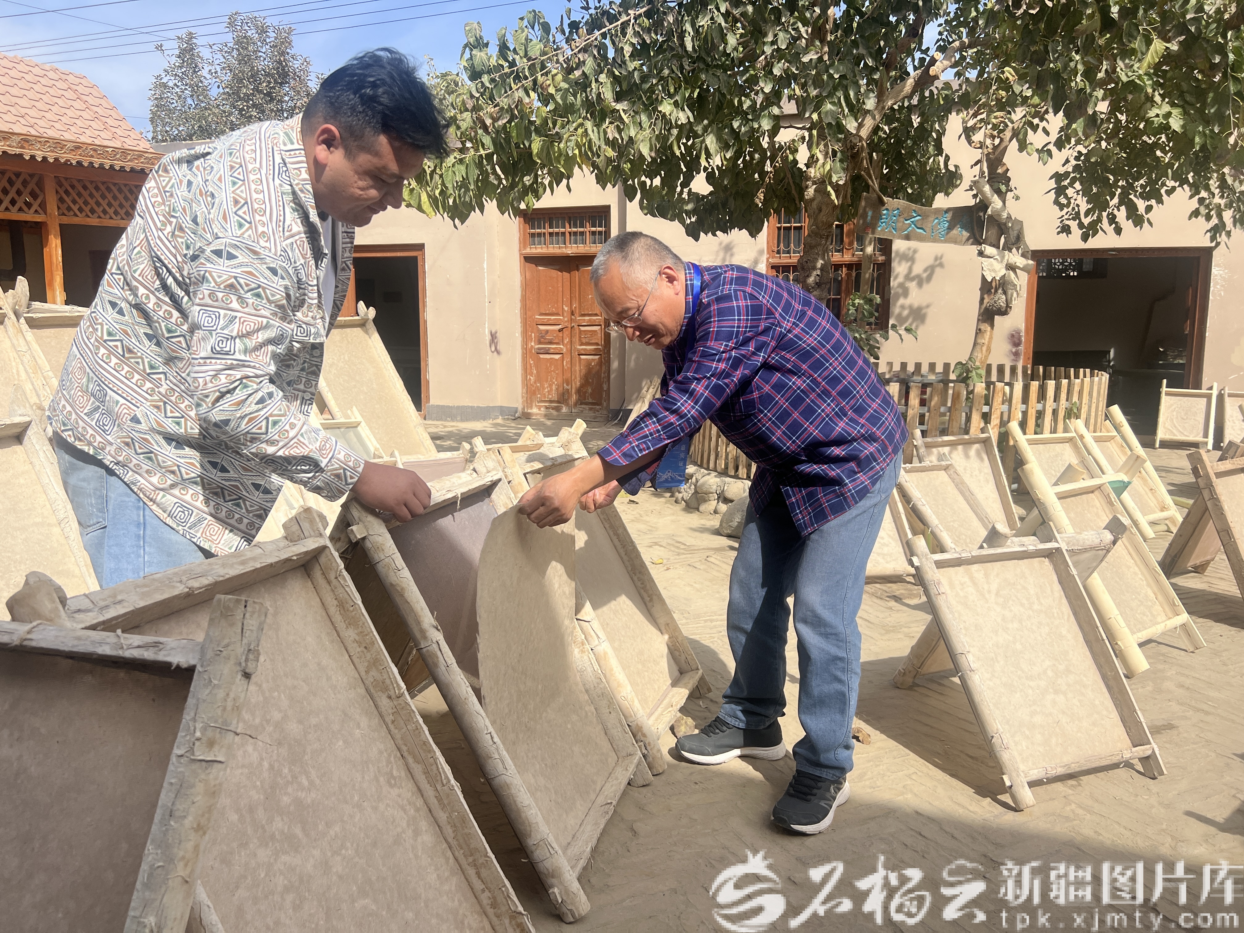 比拉力·图尔荪巴柯(左)与参观者一起揭下晾晒好的桑皮纸。天山网-新疆日报记者 拍热扎提·阿不都摄