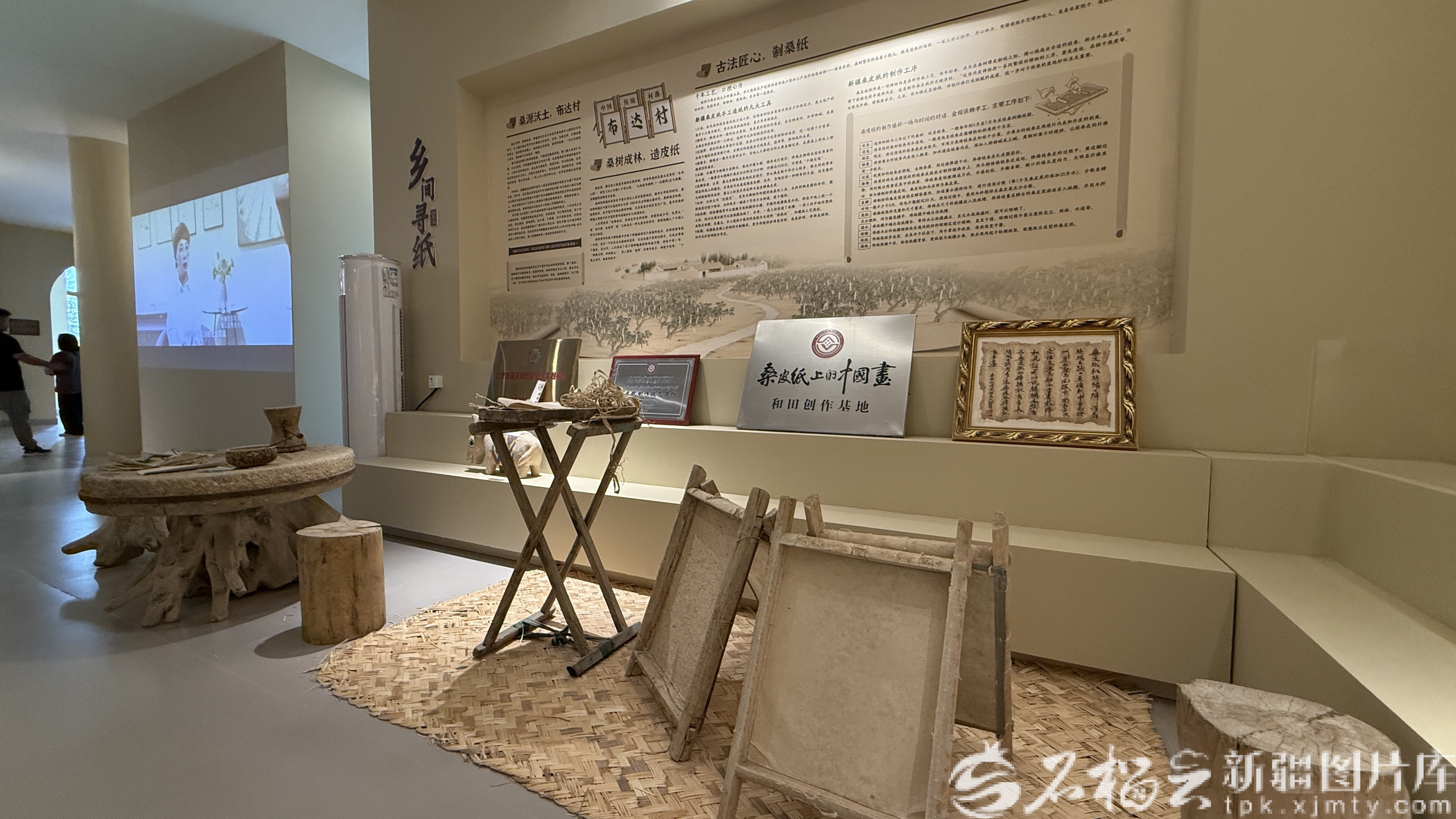 墨玉县普恰克其镇布达村桑皮纸展示馆内乡间寻纸板块陈列的桑皮纸制作流程。天山网-新疆日报记者 拍热扎提·阿不都摄
