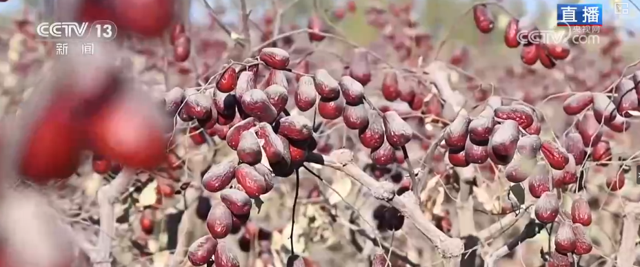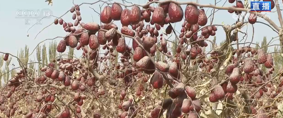 从现在一直持续到11月中旬,这里将进入繁忙的红枣采收阶段。在和田,红枣并不是一成熟就采收的。由于当地气候干燥,种植户会在红枣成熟后,让枣留在树上自然风干。这种“吊干”方式会让红枣的甜度高,同时也更便于储存和运输。这棵红枣树,部分红枣的表皮已经出现自然褶皱,正在脱水变干,这个样子就是差不多风干好,可以采收。