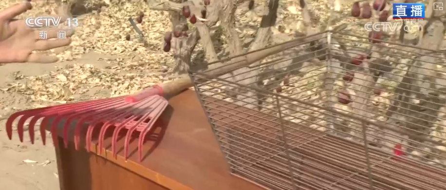 这些是在采收中会用到的工具,先用这种耙子将落地红枣拢在一起,掺杂其中的树叶,用棍子、耙子压碎后装进特制的筛子或是这种有网孔的筐子,通过人工来筛除树叶和尘土。或者是用这样的吹风装置,过滤掉树叶和沙土,红枣就可以直接收拢装筐。这些红枣会先送到晾晒场进行晾晒,再经过清洗、筛选、烘干后,一部分送进加工企业,制成休闲食品和饮料,一部分直接打包发往全国市场。