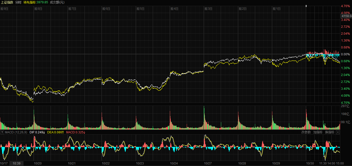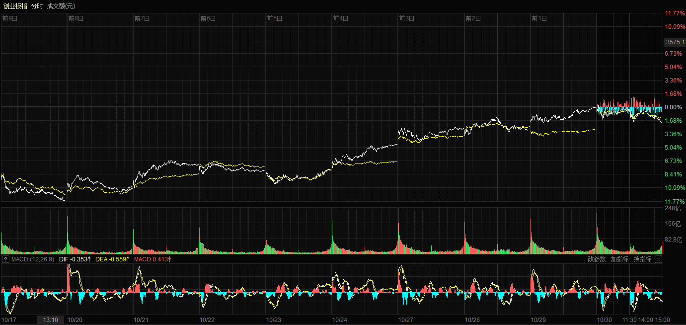 天山网-新疆日报讯(记者康颢严报道)10月30日,A股三大指数集体回调。截至收盘,沪指跌0.73%,报收3986.90点;深证成指跌1.16%,报收13532.13点;创业板指跌1.84%,报收3263.02点。沪深两市成交额达到24217亿元,较昨日放量1656亿元。