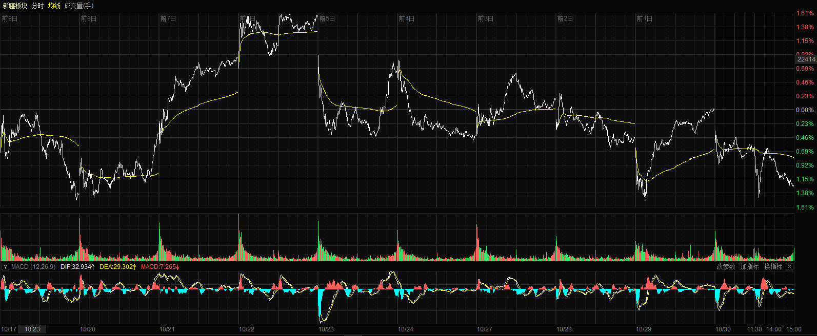10月30日收盘时,新疆板块指数跌1.28%,报收21960.51点,14只股票上涨,47只股票下跌,个股上涨比例为22.95%,总换手率2.03%,总成交额245.38亿元。