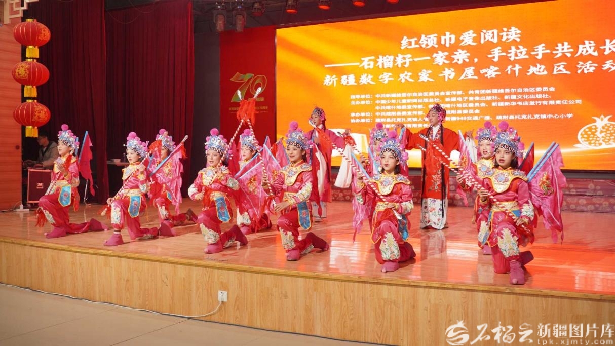 近日,在“红领巾爱阅读——石榴籽一家亲,手拉手共成长”新疆数字农家书屋喀什地区活动中,疏附县托克扎克镇中心小学的少先队员们在表演戏曲《穆桂英挂帅》。高溢蔓 摄