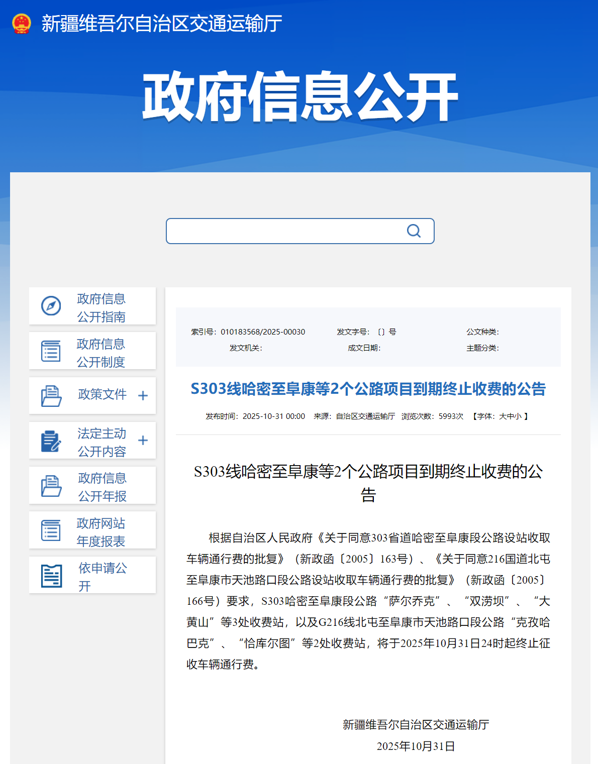石榴云/新疆日报讯 10月31日,自治区交通运输厅网站发布公告称,S303哈密至阜康段公路萨尔乔克、双涝坝、大黄山等3处收费站,以及G216线北屯至阜康市天池路口段公路克孜哈巴克、恰库尔图等2处收费站,于2025年10月31日24时起终止征收车辆通行费。