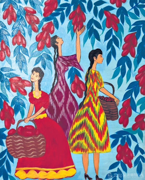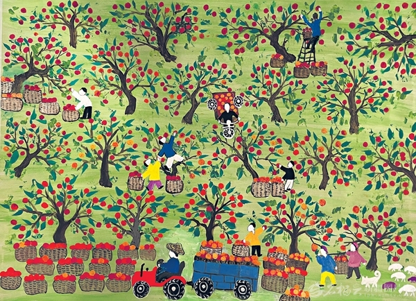 深秋丰收季,新疆农民画创作者纷纷挥动画笔,以浓墨重彩与质朴笔触,将田间金穗低垂、瓜果飘香的盛景定格纸上。一幅幅作品色彩鲜明、饱含生活热忱,既绘出五彩缤纷的丰收底色,也勾勒出农户欢颜劳作的鲜活场景,生动诠释了深秋新疆的丰收之美与乡土韵味。