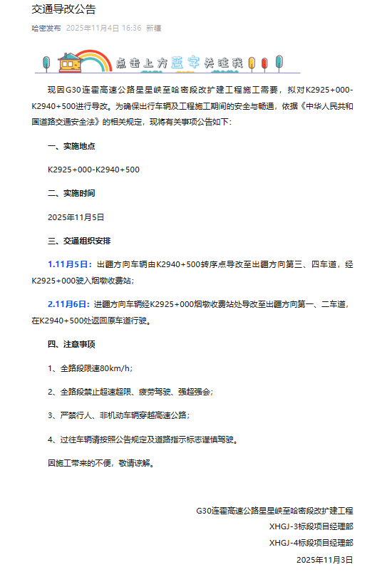 石榴云/新疆日报讯 11月4日,“哈密发布”微信公众号发布交通导改公告称,因G30连霍高速公路星星峡至哈密段改扩建工程施工需要,拟对K2925+000-K2940+500进行导改。11月5日-6日,车辆由此进出疆需要按照公告规定路线走。
