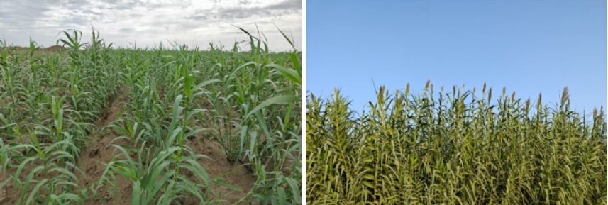 菌草“绿洲1号”芦竹。2024年种植时的生长状况(左)与2025年越冬1年后的生长状况(右)