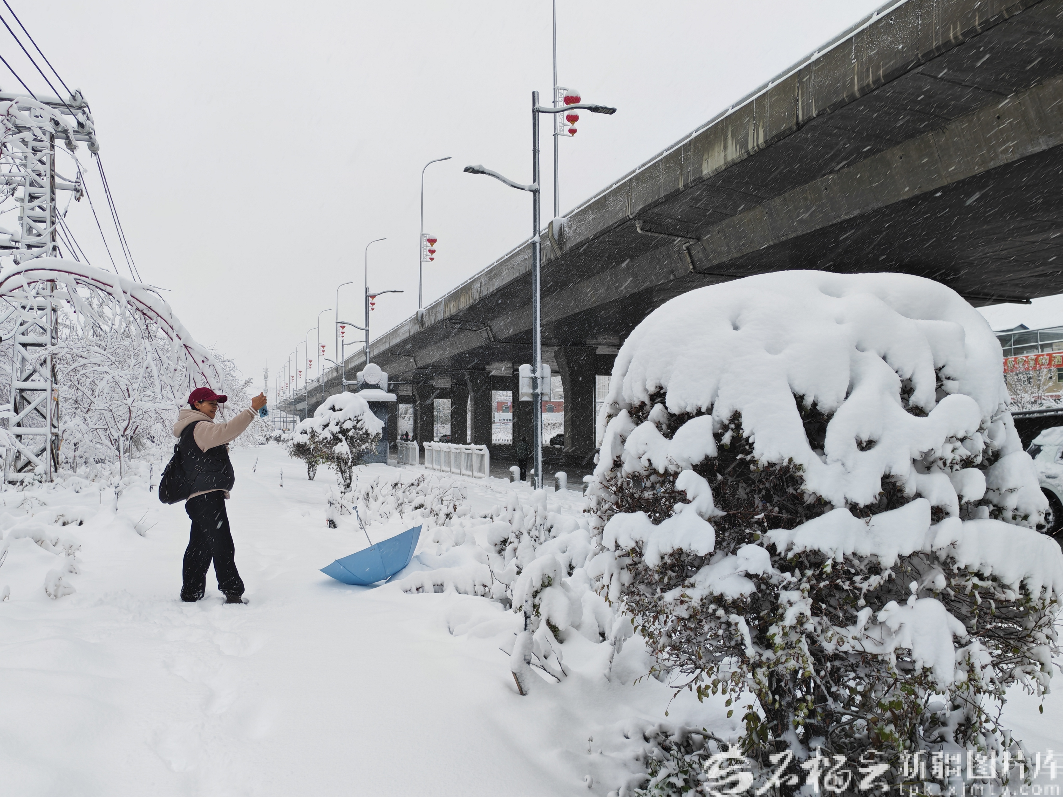 11月6日,乌鲁木齐市观园路,一位市民在拍摄雪景。 石榴云/新疆日报记者 秦梅花摄