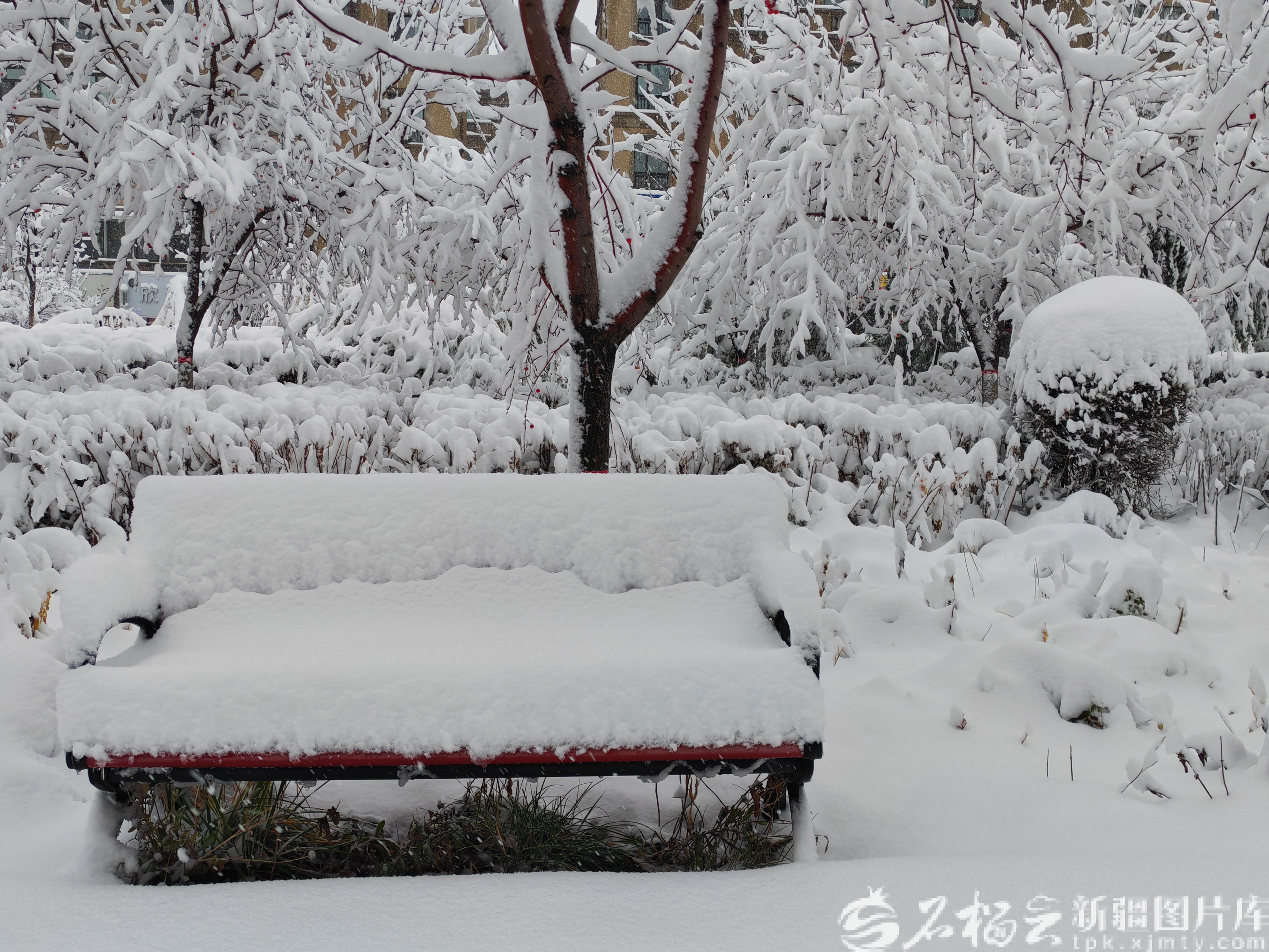 11月6日,乌鲁木齐市观园路,步道上的座椅落满了积雪。 石榴云/新疆日报记者 秦梅花摄