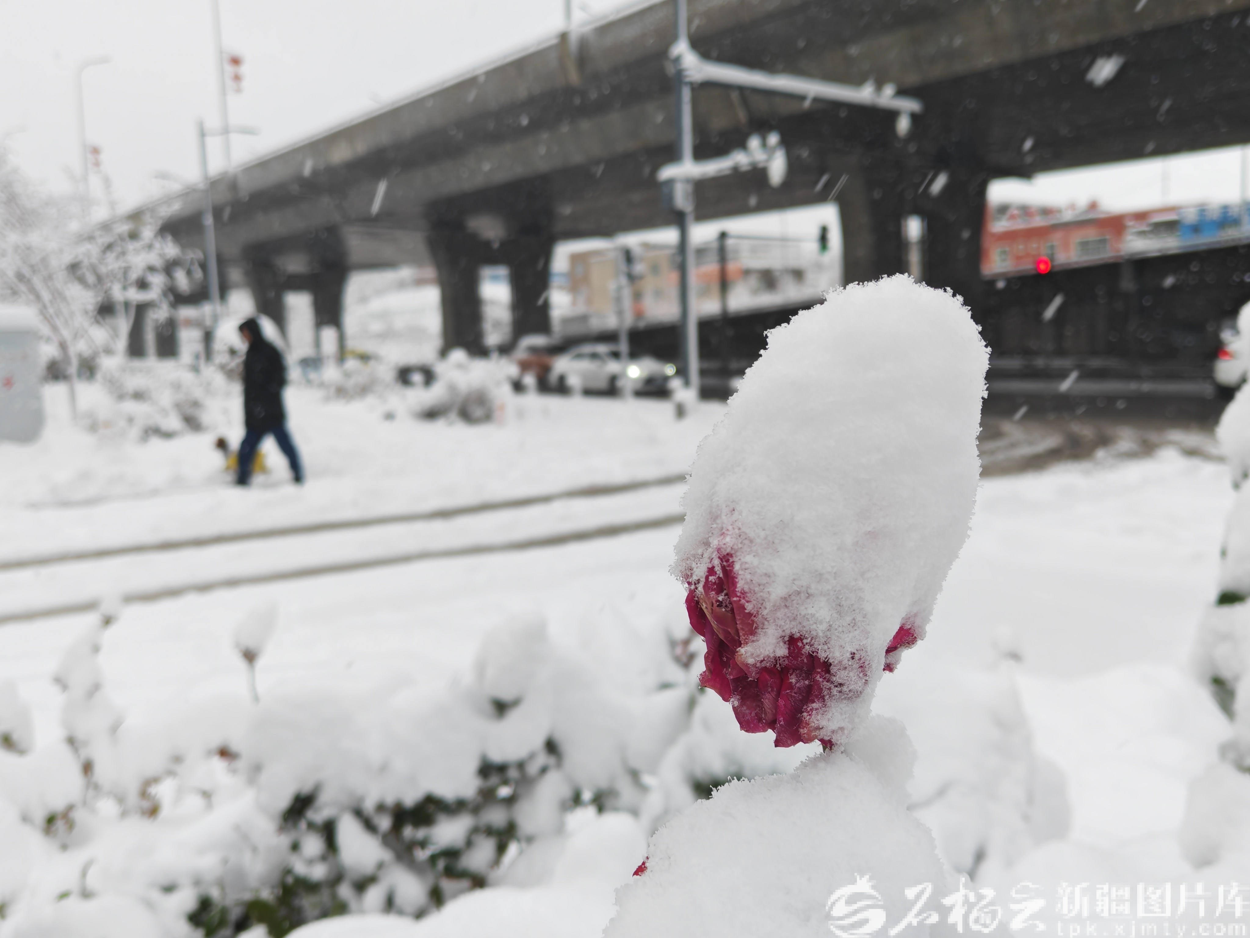 11月6日,乌鲁木齐市观园路,花朵上落满积雪。 石榴云/新疆日报记者 秦梅花摄
