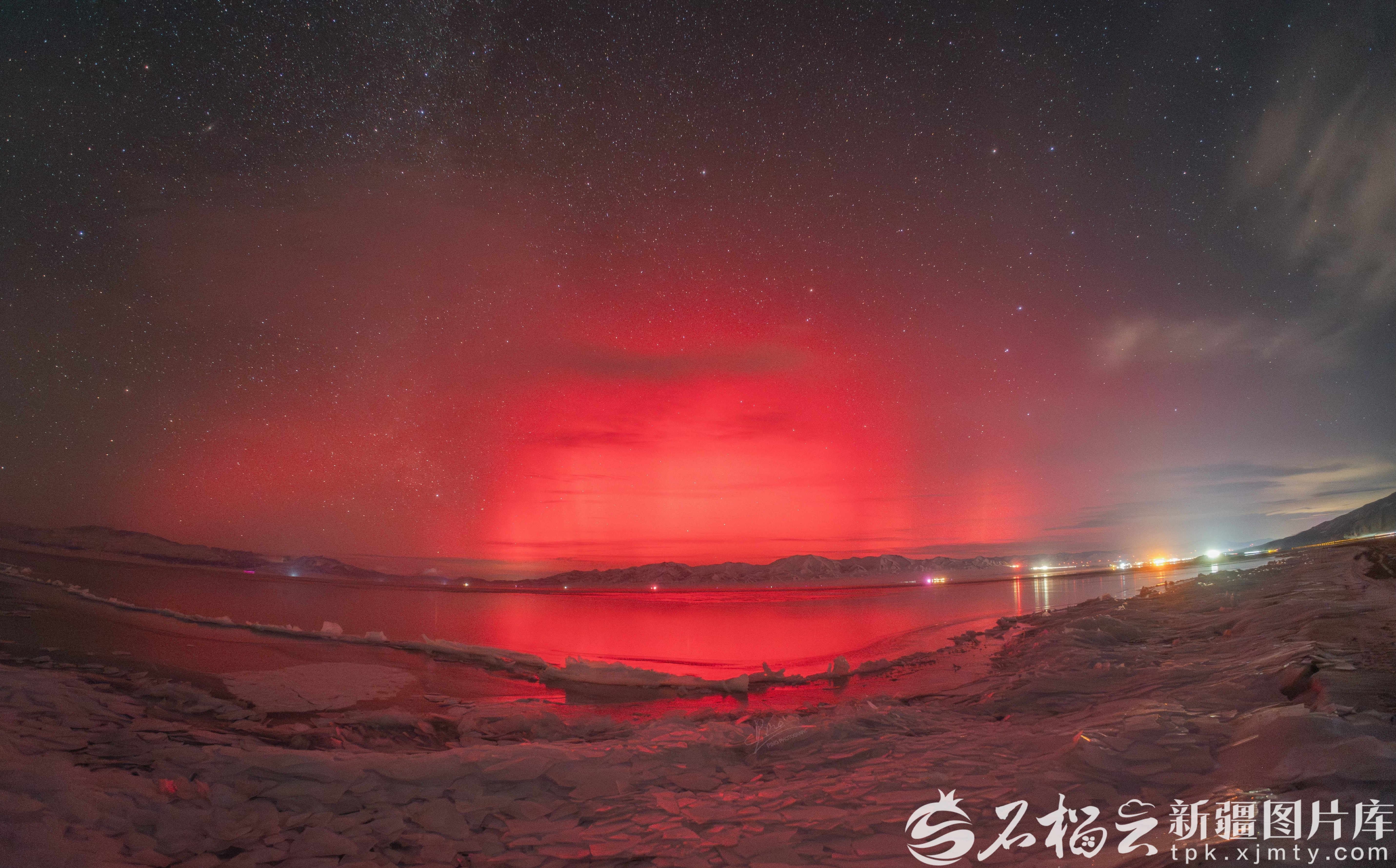 今年1月1日晚,在博州赛里木湖,极光红透了半边天。图/高嘉豪摄