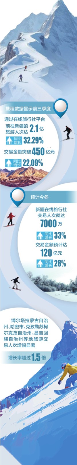 这个冬季,新疆冰雪旅游正迎来前所未有的热浪。携程集团最新发布的《2025新疆冬季旅游预测》显示,今冬新疆仅在线旅行社交易人次就达7000万,同比增长33%,交易金额预计增长28%,将创下历年新高。面对早早涌来的预订潮与持续走高的市场预期,新疆从北到南,从雪场到高原,已全面进入“迎冬”状态,以更丰富的业态、更完善的设施、更暖心的服务,迎接四海宾朋。