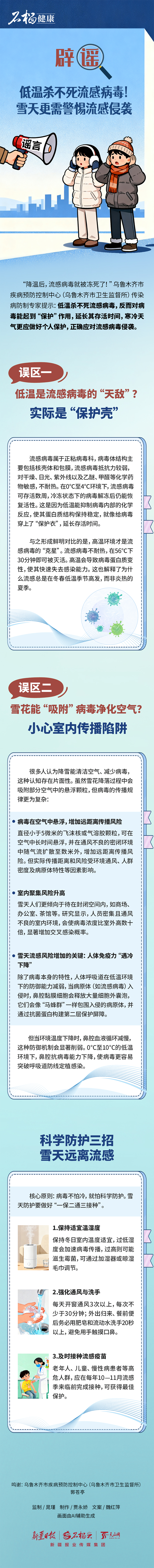 “降温后,流感病毒就被冻死了!”乌鲁木齐市疾病预防控制中心(乌鲁木齐市卫生监督所)传染病防制专家提示:低温杀不死流感病毒,反而对病毒能起到“保护”作用,延长其存活时间,寒冷天气更应做好个人保护,正确应对流感病毒侵袭。