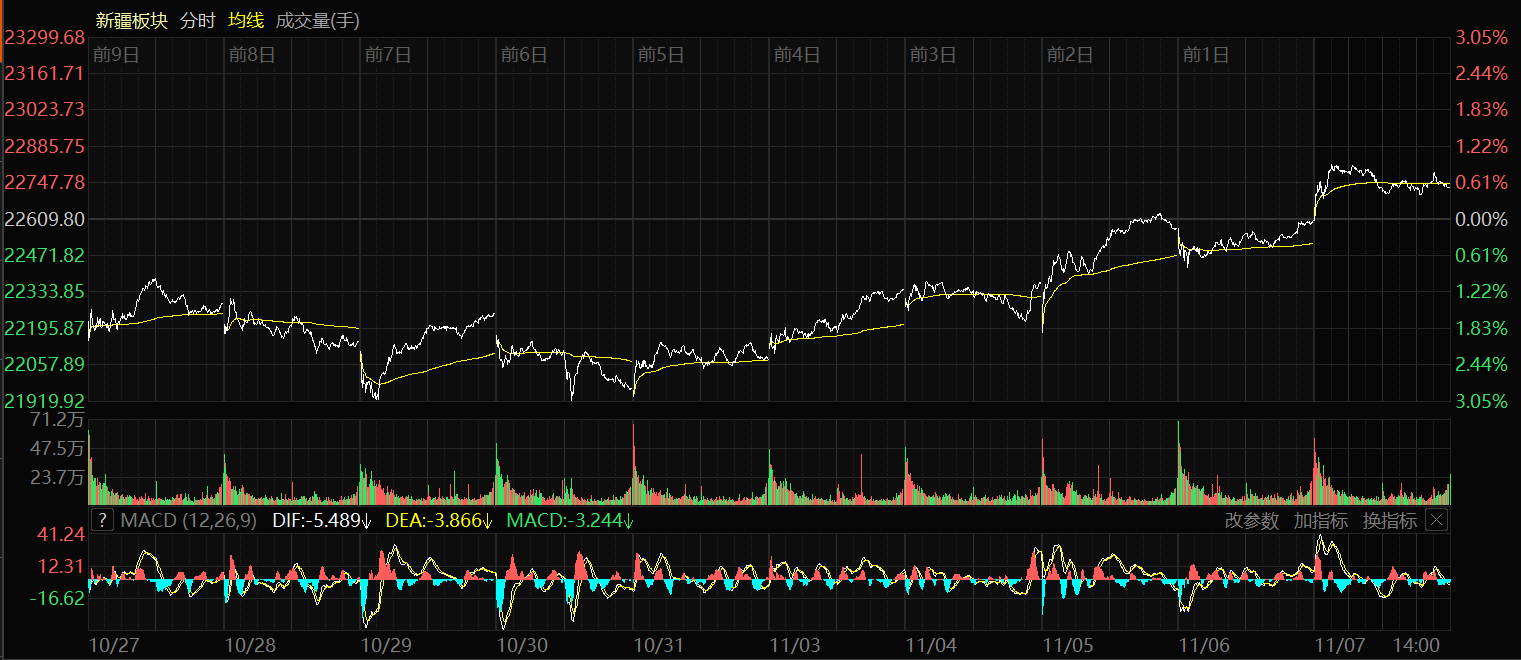 11月7日收盘时,新疆板块指数涨0.51%,报收22724.50点,31只股票上涨,27只股票下跌,3只股票平盘,个股上涨比例为50.82%,总换手率2.20%,总成交额353.80亿元。