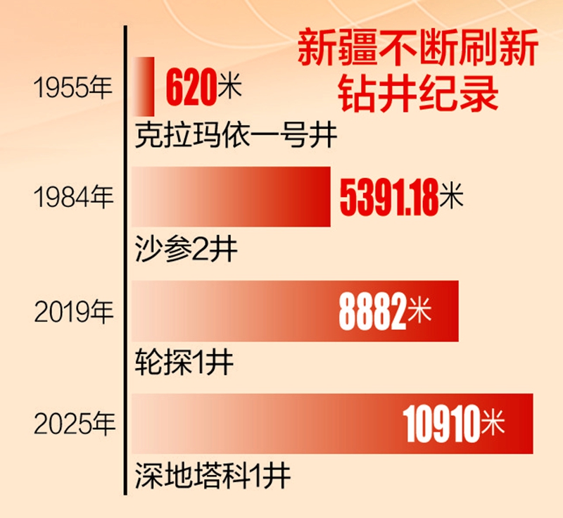 据不完全统计,目前塔里木盆地钻出的超8000米以深井已超过350口,其中最深井为塔里木油田2025年初钻成的深地塔科1井,完钻井深10910米,成为世界陆上第二、亚洲第一垂深井,创全球和亚洲五大工程纪录。