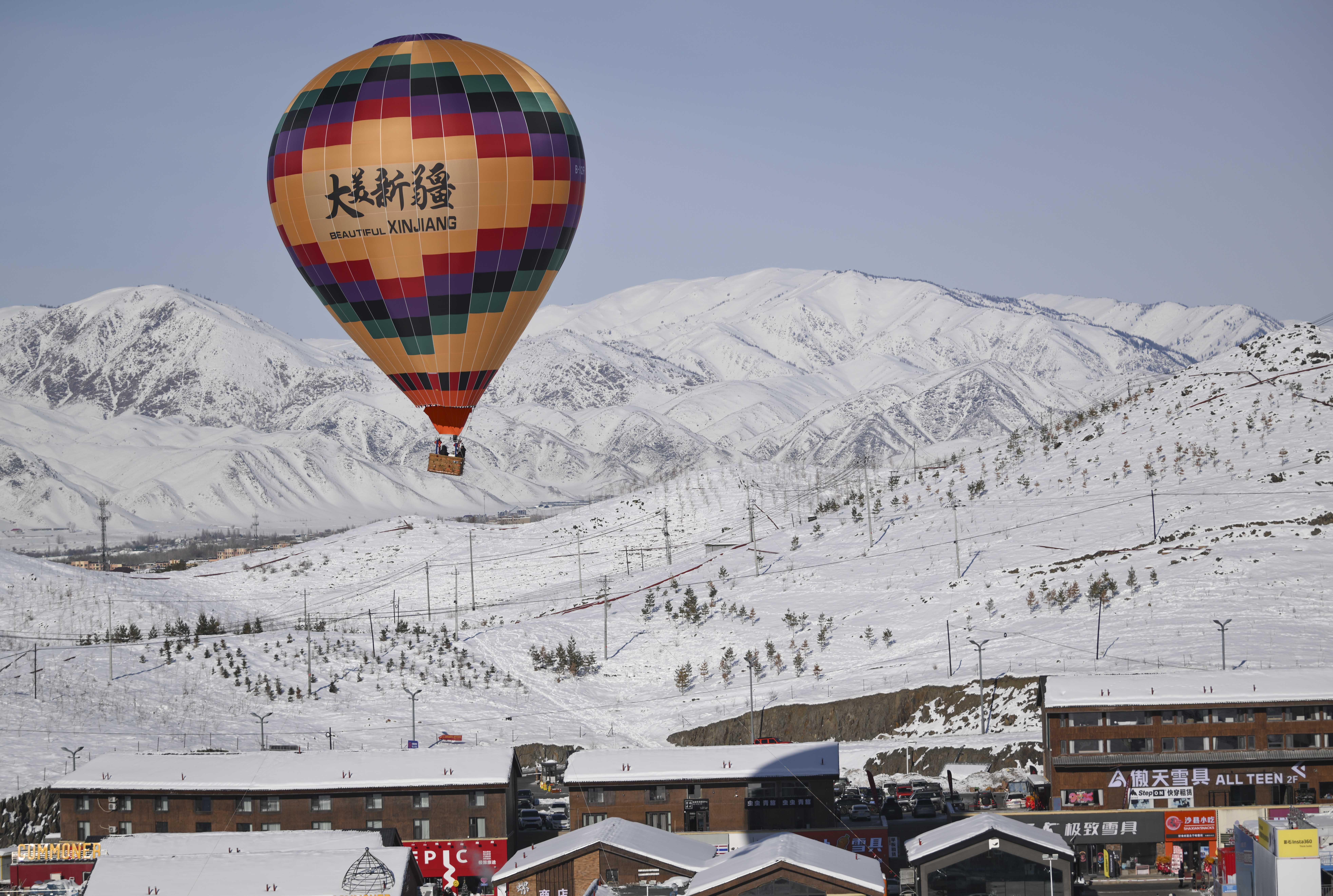 这是游客在新疆阿勒泰将军山国际滑雪度假区乘坐热气球赏雪景(1月25日摄)。新华社记者 胡虎虎 摄