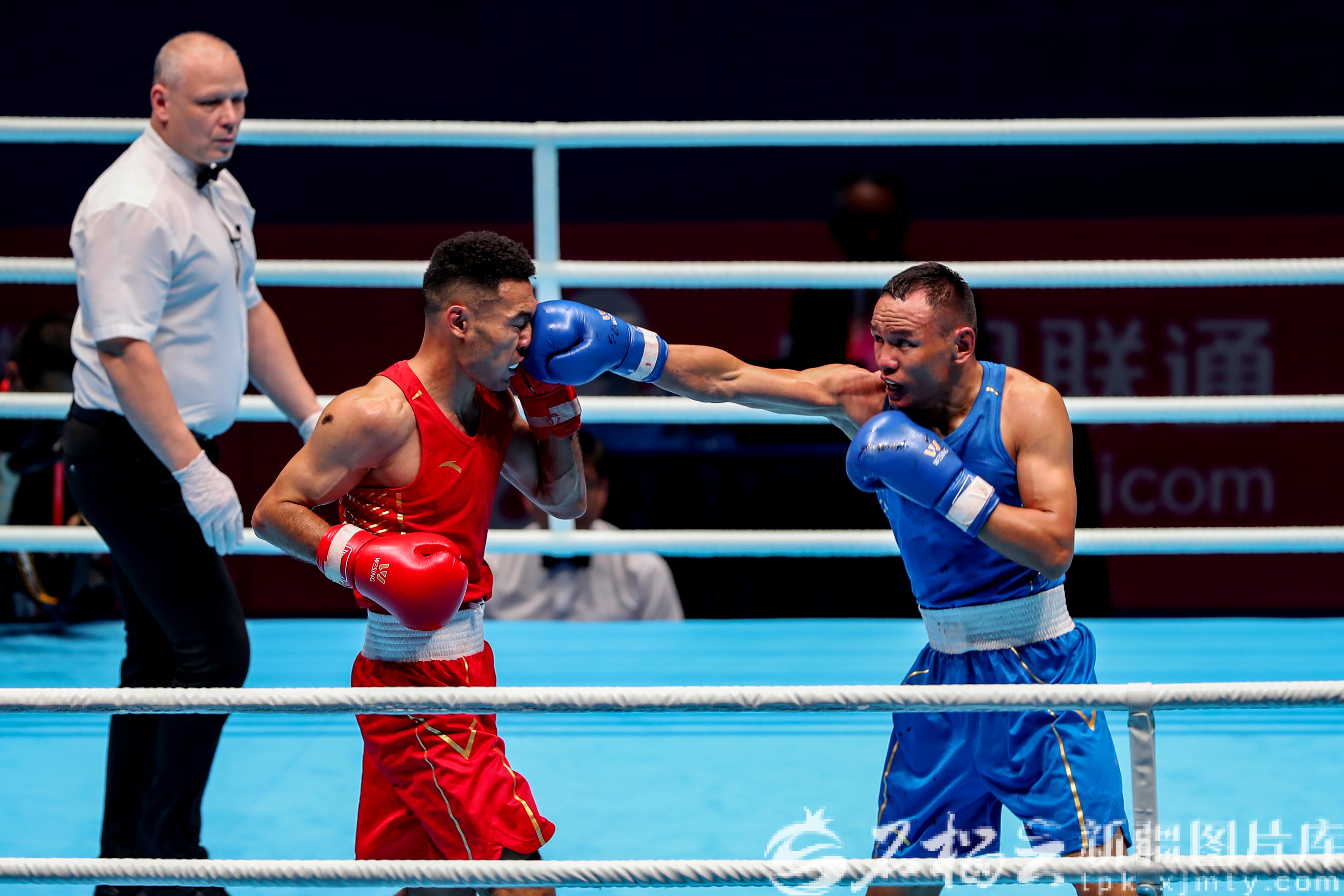 11月13日,新疆拳击队运动员叶尔达吾列提·买依兰别克(蓝)在比赛中。