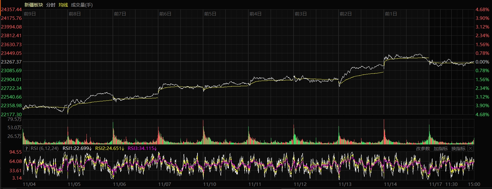 11月17日收盘时,新疆板块指数涨0.02%,报收23272.13点,28只股票上涨,31只股票下跌,2只股票平盘,个股上涨比例为45.90%,总换手率1.79%,总成交额215.59亿元。