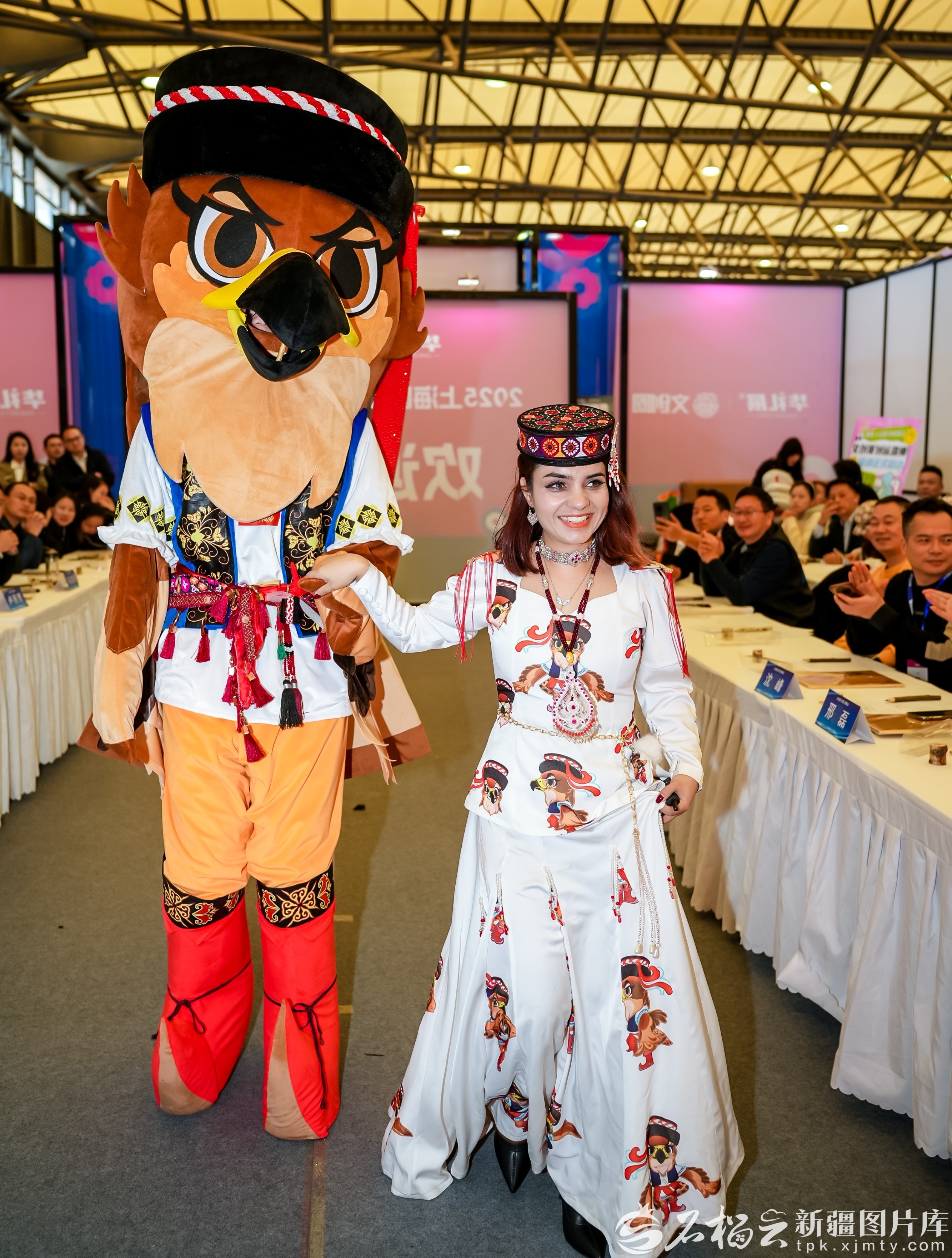 11月13日,百合提妮莎·甫拉提夏(右)带着吉祥物“帕米尔雄鹰—阿米尔”进行IP人偶服角色秀。