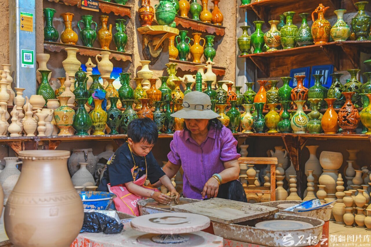 在喀什古城,传统土陶技艺焕发新生。非遗代表性传承人吐尔逊·祖农的工作坊中,游客们参与制作土陶,亲身体验制坯、雕纹等环节。“过去游客拍张照片就离开,现在他们更愿意亲手制作一件陶器带回家,了解纹样背后的文化内涵。”吐尔逊说。