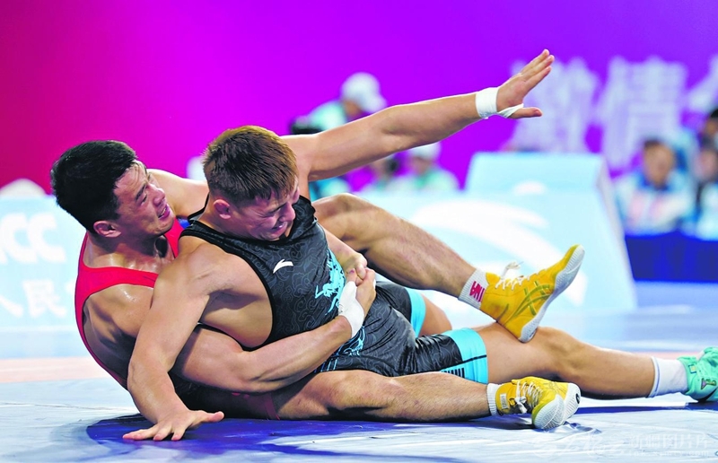 11月13日,第十五届全国运动会摔跤男子古典式97公斤级决赛中,新疆队选手阿力木拉提·达拉吾拜(右)获得银牌。