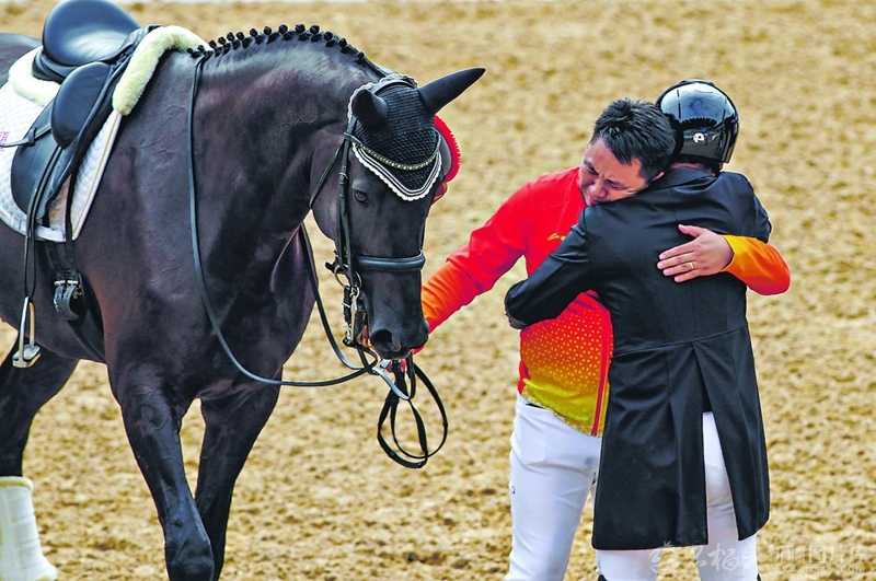 11月12日,第十五届全国运动会深圳光明国际马术中心,新疆队选手刘涛(右)夺冠后和队友紧紧拥抱在一起。