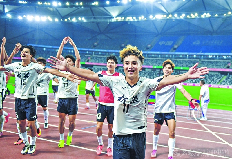 11月3日,第十五届全国运动会足球U20男子小组赛第二轮,新疆队以1∶0战胜浙江队后,球员庆祝胜利。