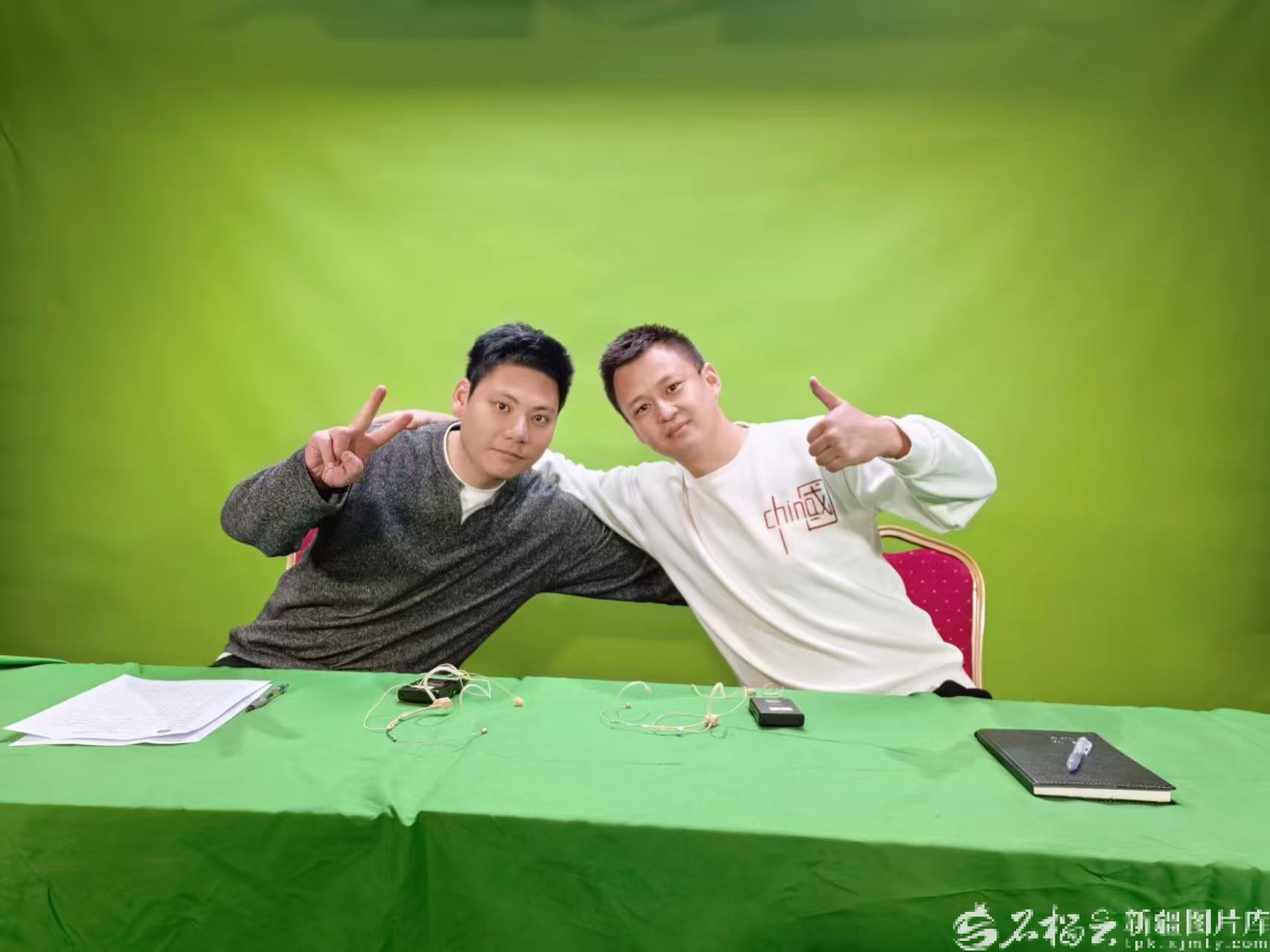 陈科桦(左)与新疆足球解说员乔伟(右)在直播间合影。天山网-新疆日报记者阿比拜 摄