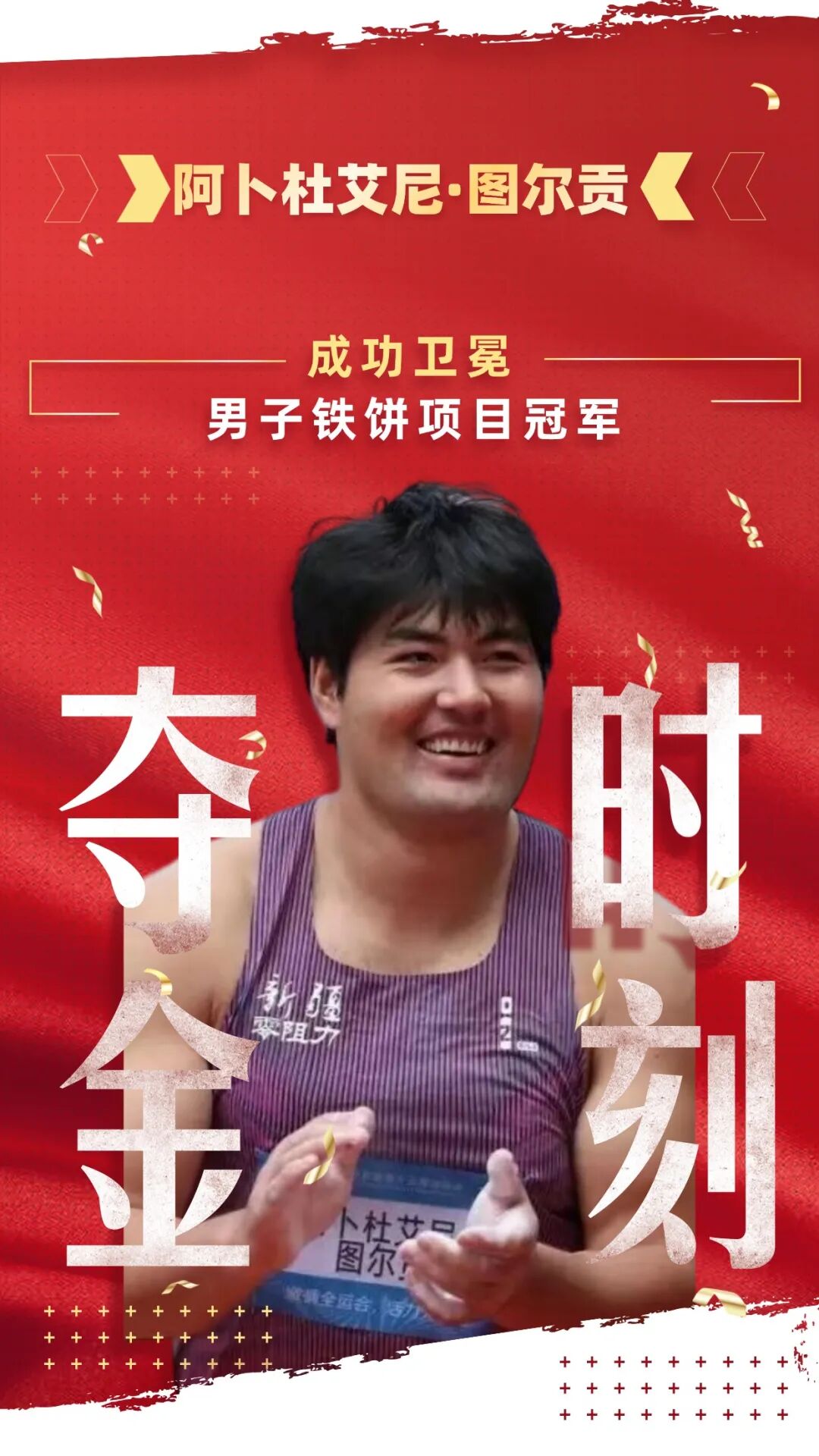 11月20日,新疆选手阿卜杜艾尼·图尔贡获得第十五届全国运动会田径男子铁饼冠军。阿卜杜艾尼·图尔贡,2025年4月以65.35米打破李少杰保持29年的男子铁饼全国纪录,6月在国际田径投掷专项赛以67.29米再度刷新纪录并夺冠,5月实现亚锦赛两连冠。2025年9月入选世界田径锦标赛中国代表团。