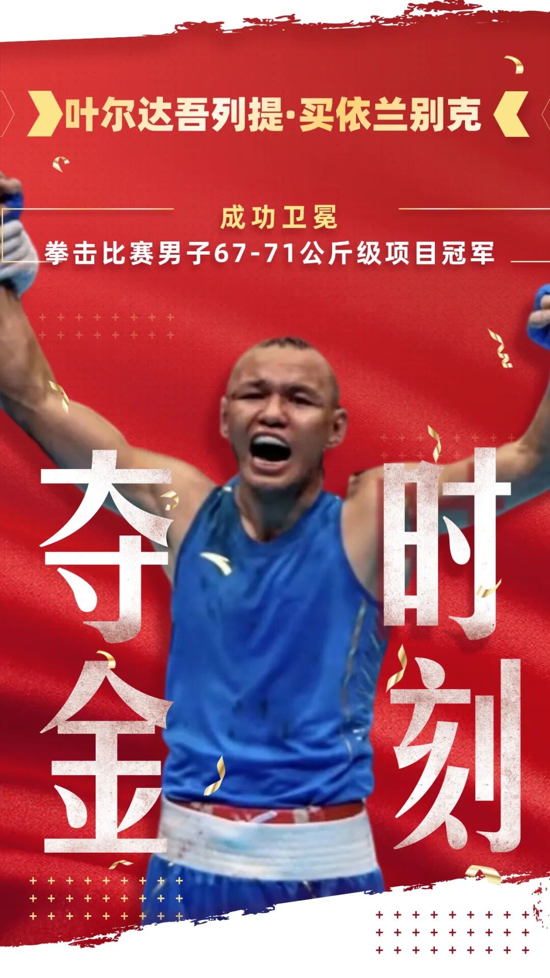 11月13日,第十五届全国运动会拳击比赛男子67—71公斤级决赛在深圳市举行。新疆拳击队运动员叶尔达吾列提·买依兰别克战胜北京市拳击队的乌勒怕尔·哈尔恒,为新疆代表团再添一枚金牌。
