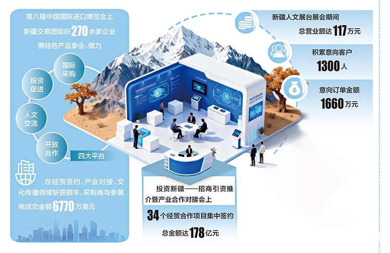 从首次参会的探路者到多次参会的老朋友,新疆企业在进博会上不断校准发展定位,通过对接优质资源、学习先进技术、深化国际合作,实现自身发展提质升级,成为新疆扩大对外开放的坚实力量。