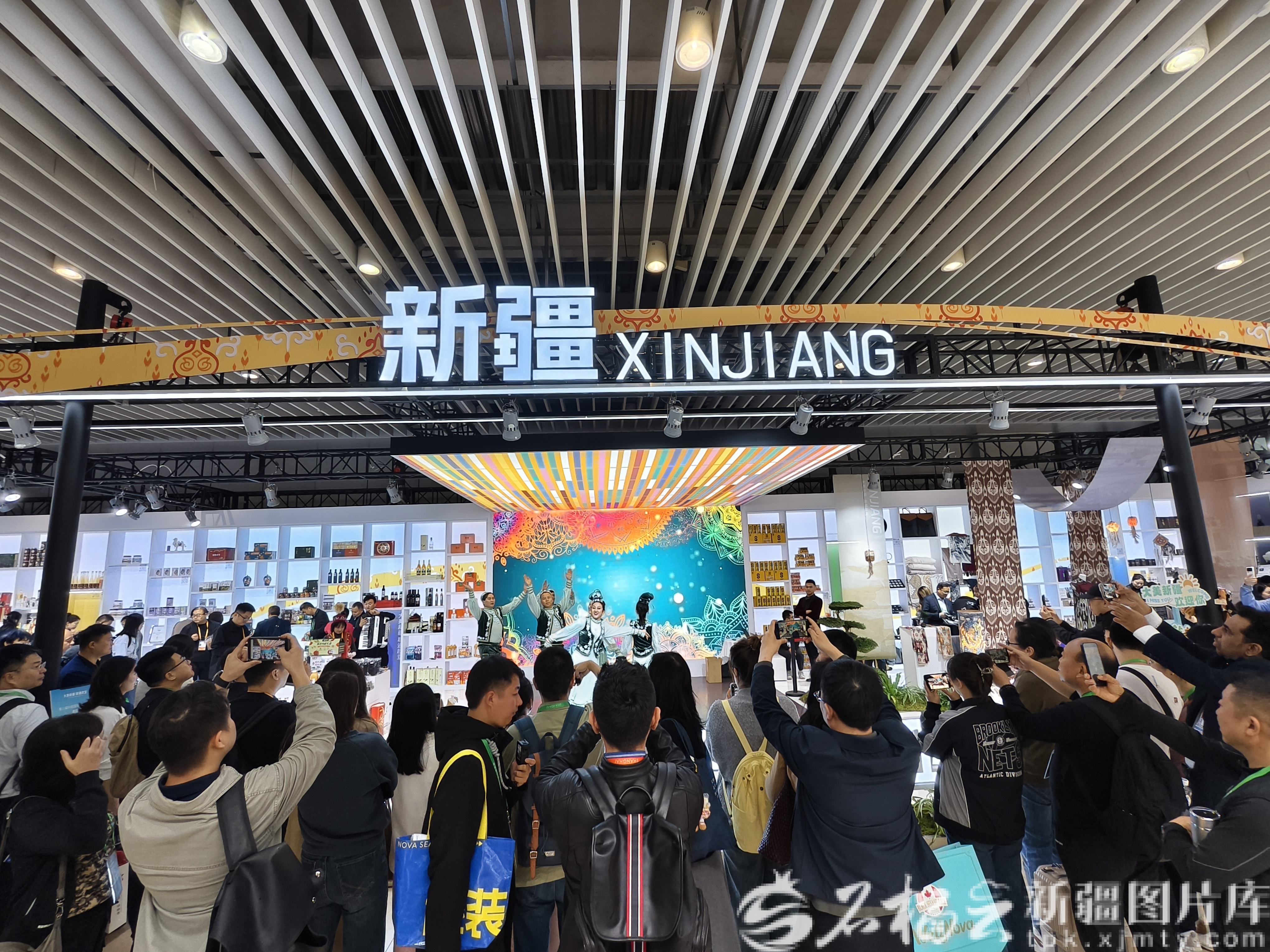 11月7日,第八届中国国际进口博览会新疆展厅内掌声与赞叹声此起彼伏,塔城歌舞团带来的专场演出吸引了大批观众驻足观赏。石榴云/新疆日报记者 黑宏伟摄