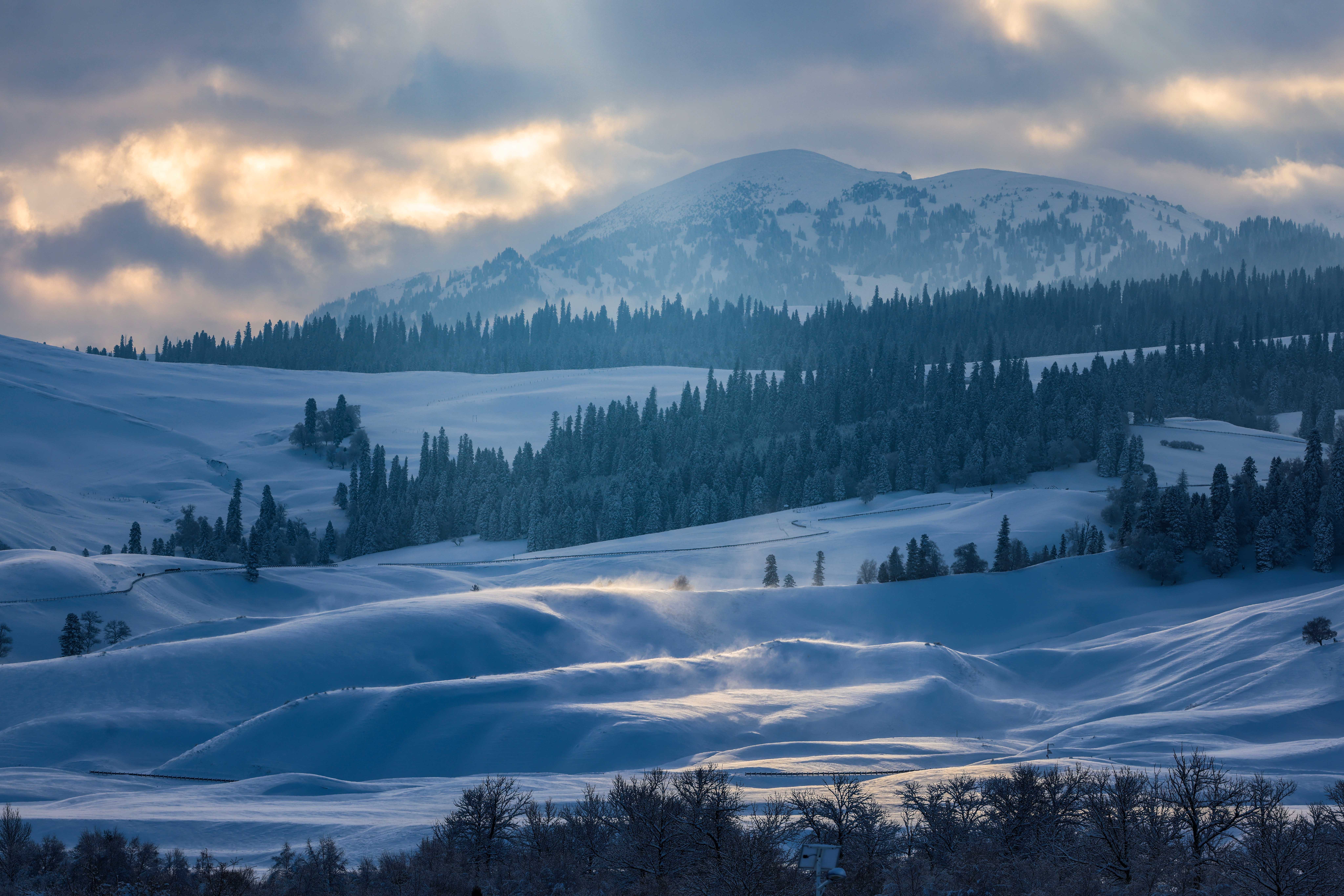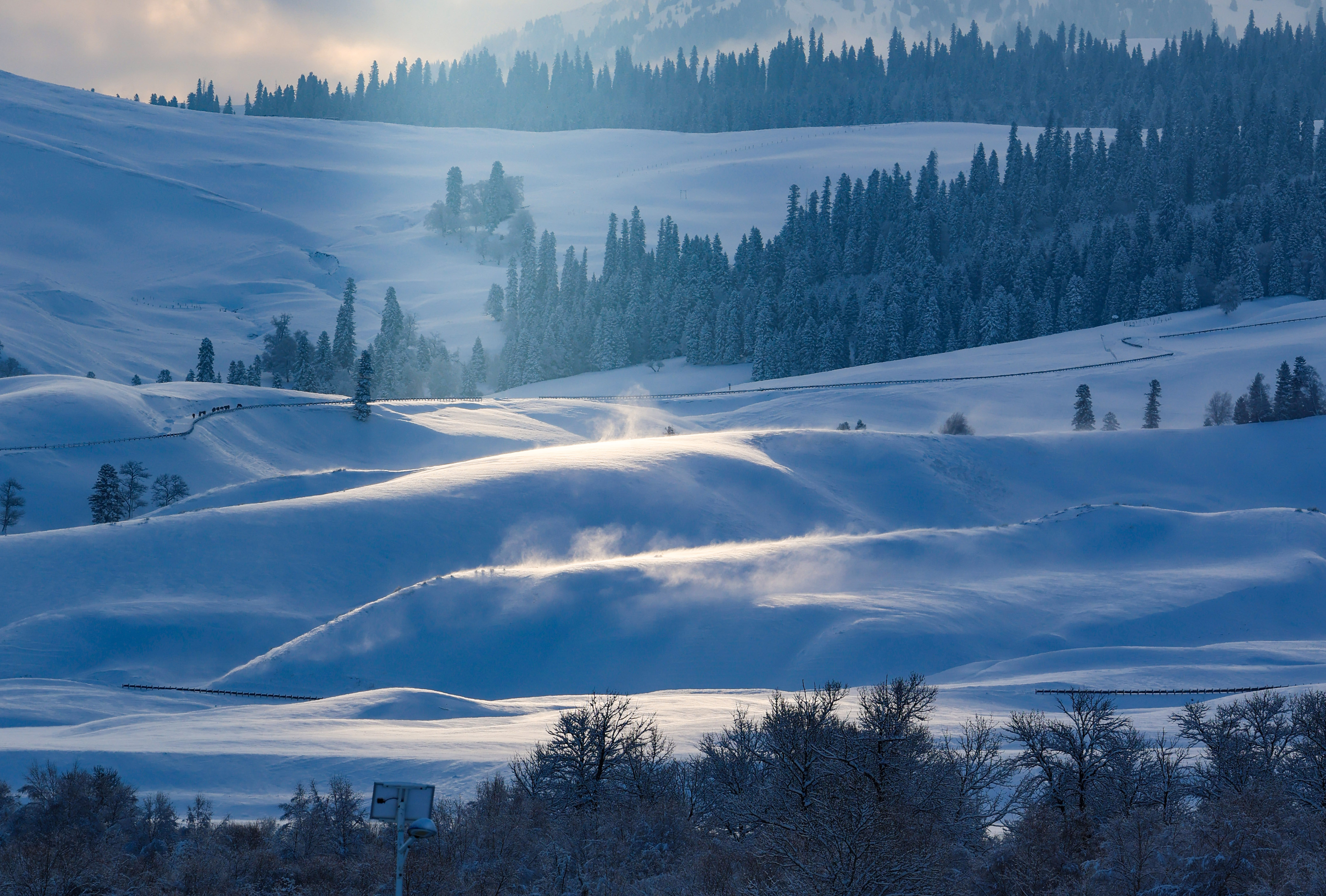 11月23日,清晨阳光奋力穿透云层,洒向那拉提银装素裹的那拉提草原。