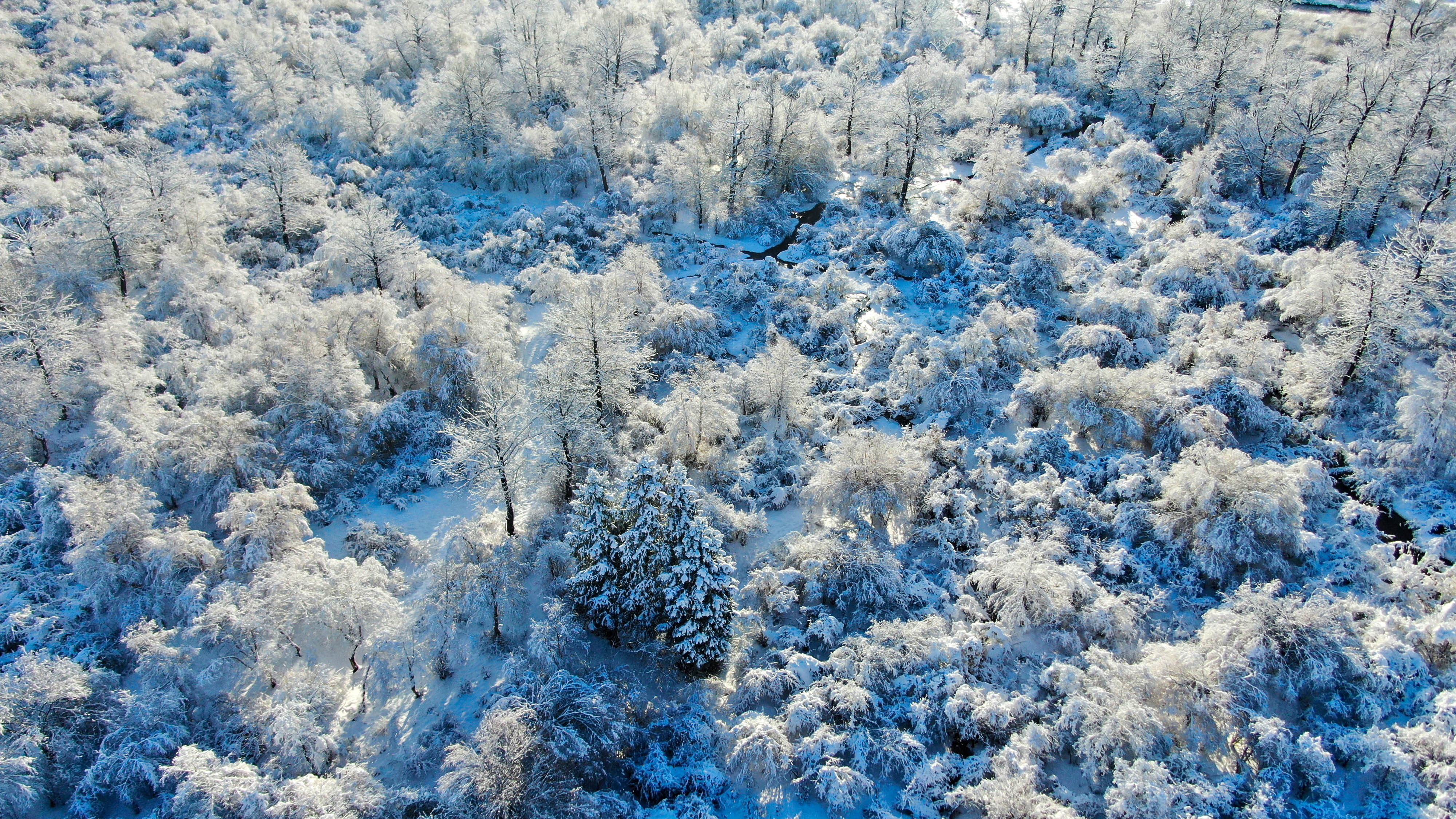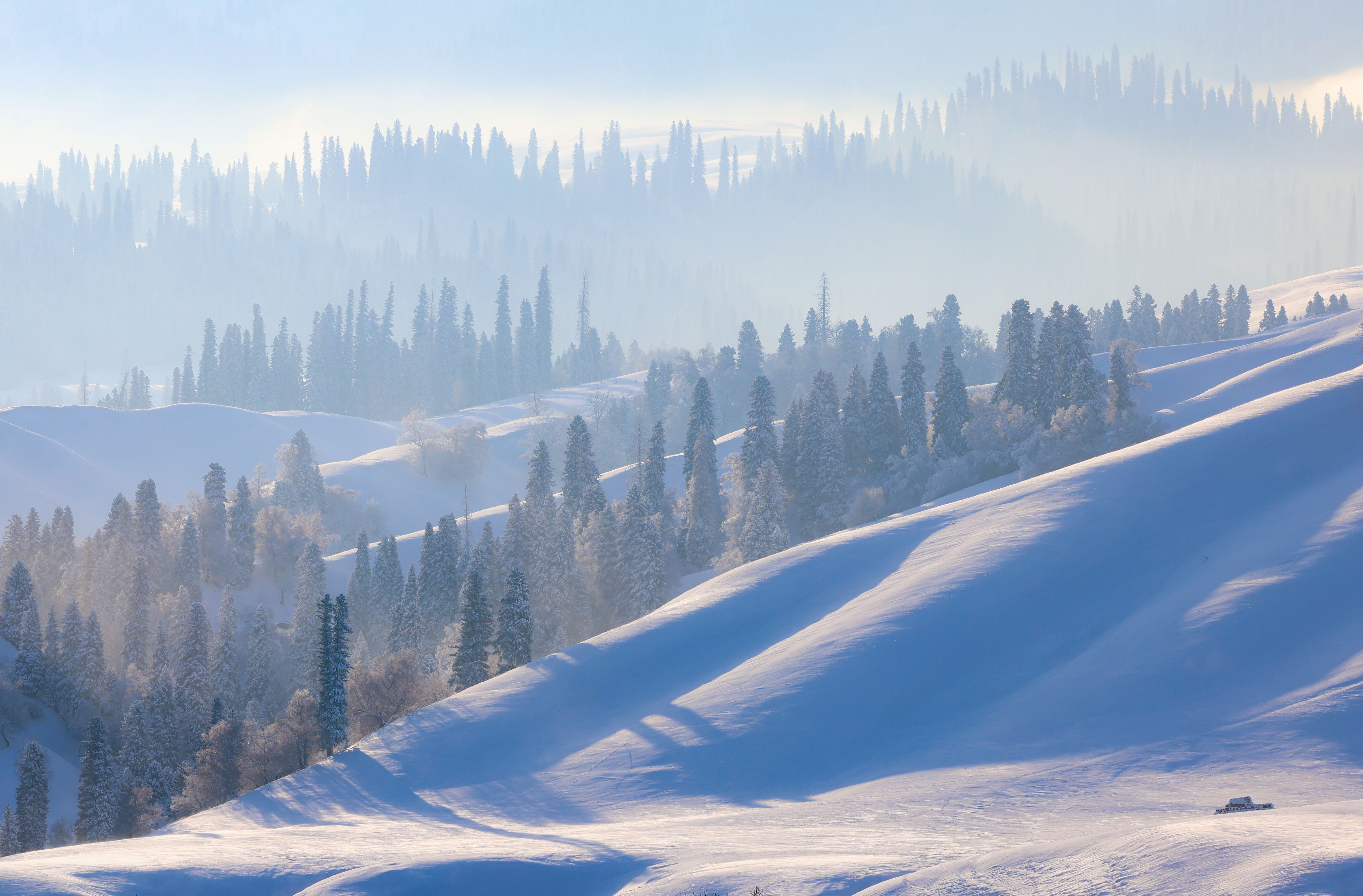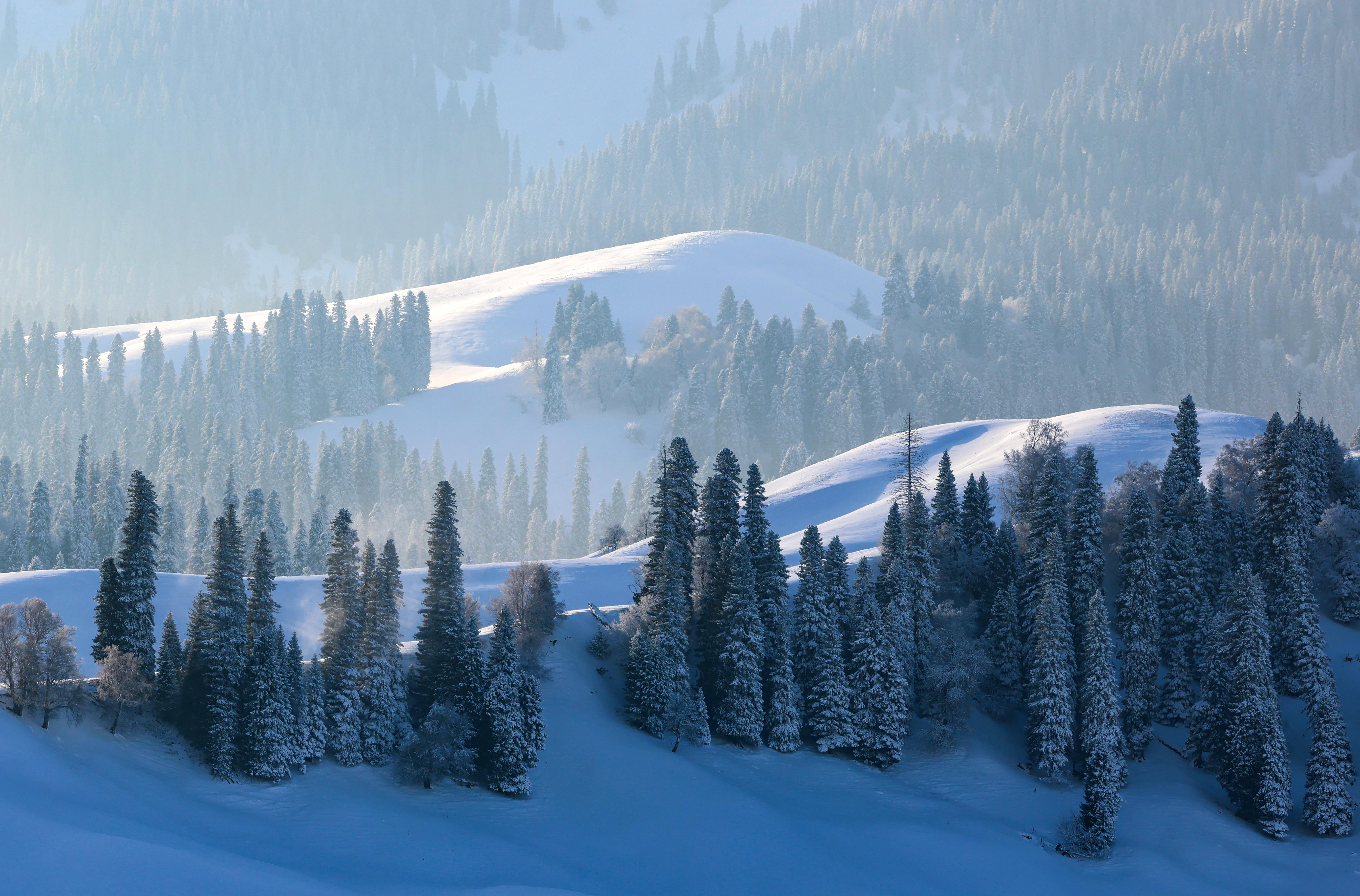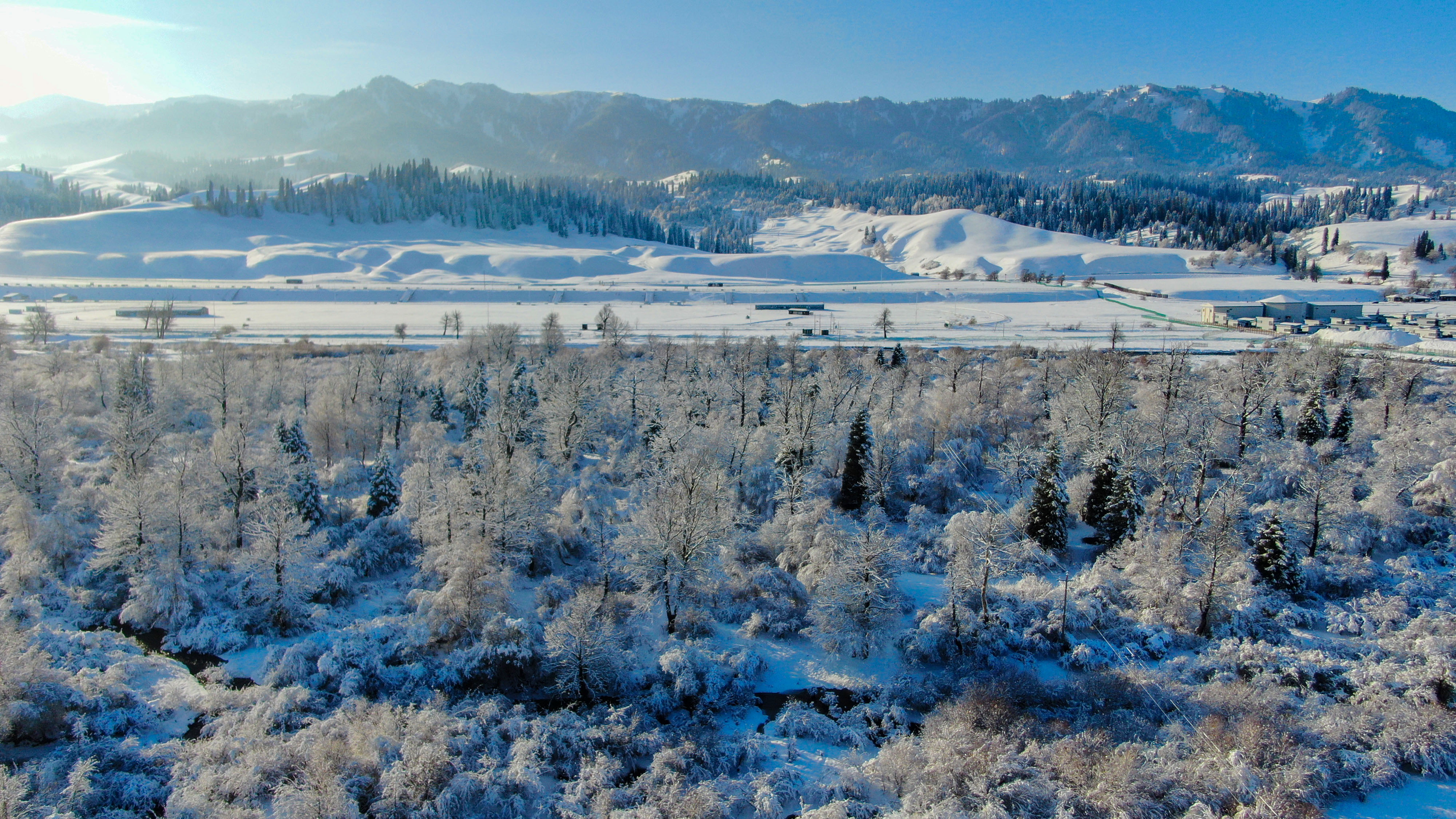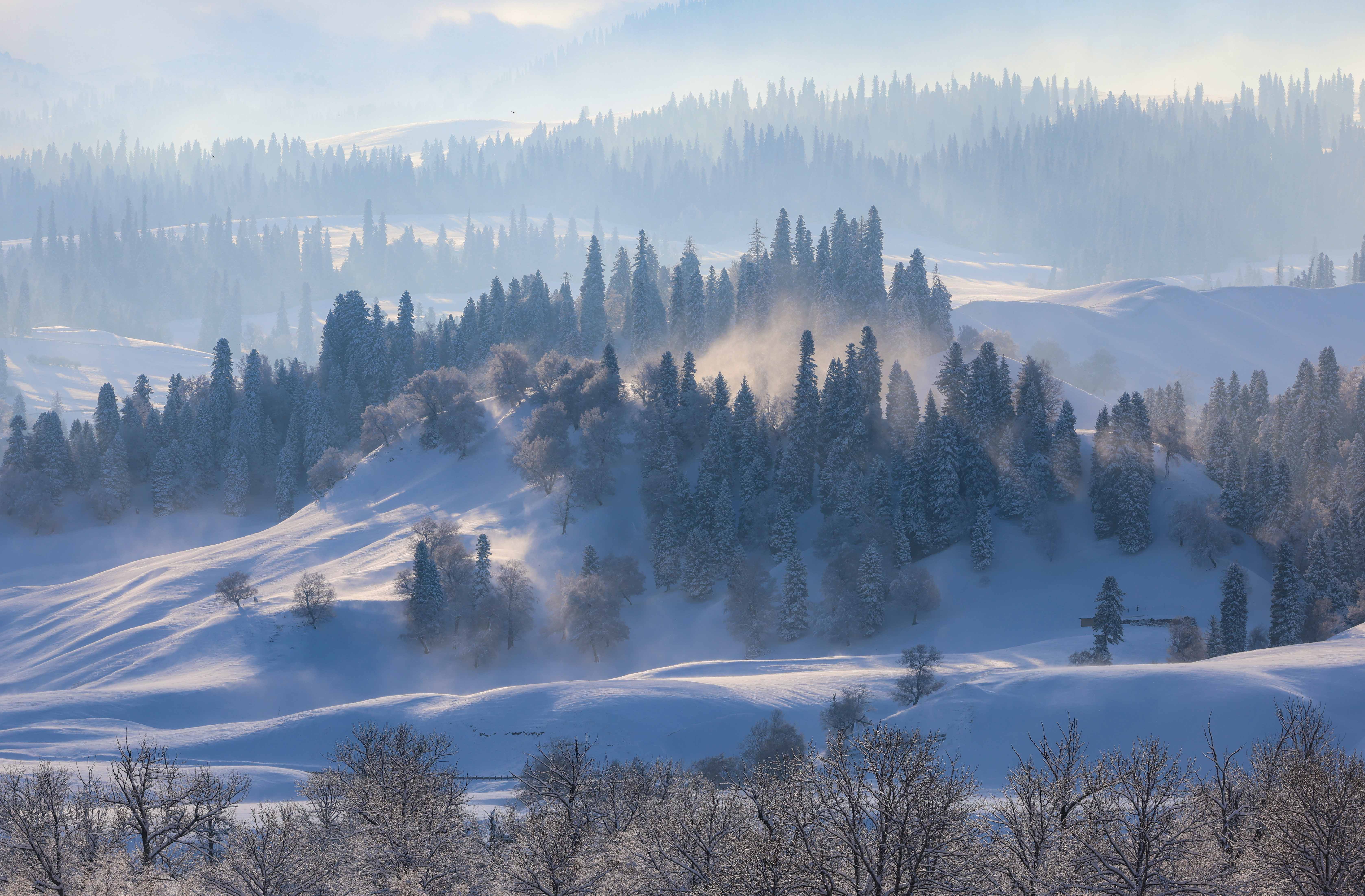 东风卷起地面细碎雪粒,形成灵动的“风吹雪”,雪雾在晨光中流转,宛如轻纱漫舞。河流两岸的树木缀满晶莹树挂,经阳光映照,折射出剔透光泽。起伏的山体在光影交错中明暗分明,沟壑间的残雪与向阳处的亮面勾勒出立体轮廓,将草原的曲线之美展现得淋漓尽致。此刻的那拉提,既有北国冰雪的壮阔雄奇,又不失江南雪景的婉约灵动。
