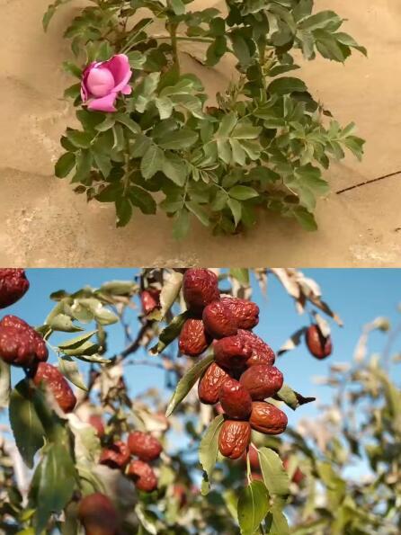 于田县的玫瑰花、柯柯牙的红枣等通过滴灌、微喷等节水技术,在沙地上茁壮成长,不仅锁住了风沙,还形成产业,带来了持续增收。