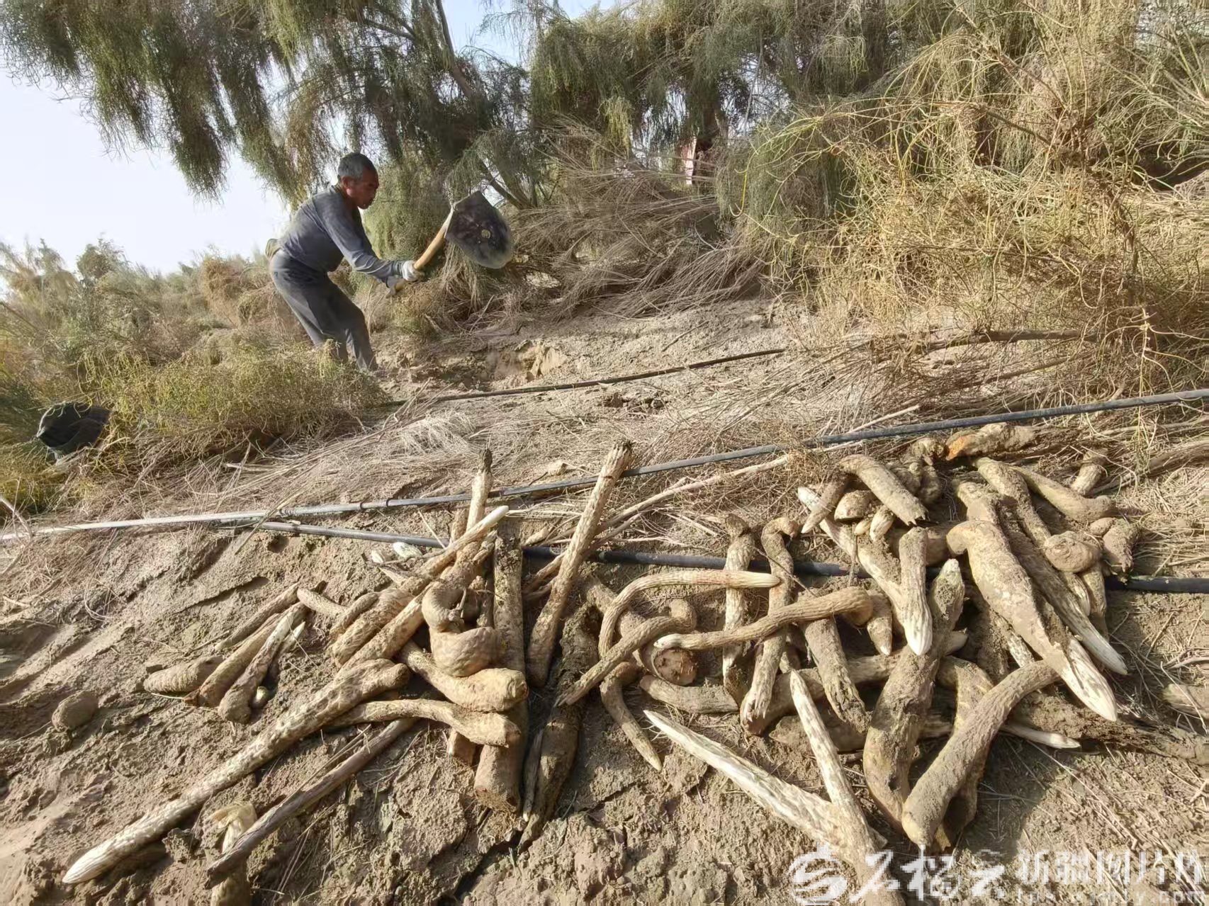 10月23日,任朋辉站在一人多高的梭梭林带里,看着工人从梭梭根部挖出一根根肉苁蓉,脸上绽放出苦尽甘来的喜悦。