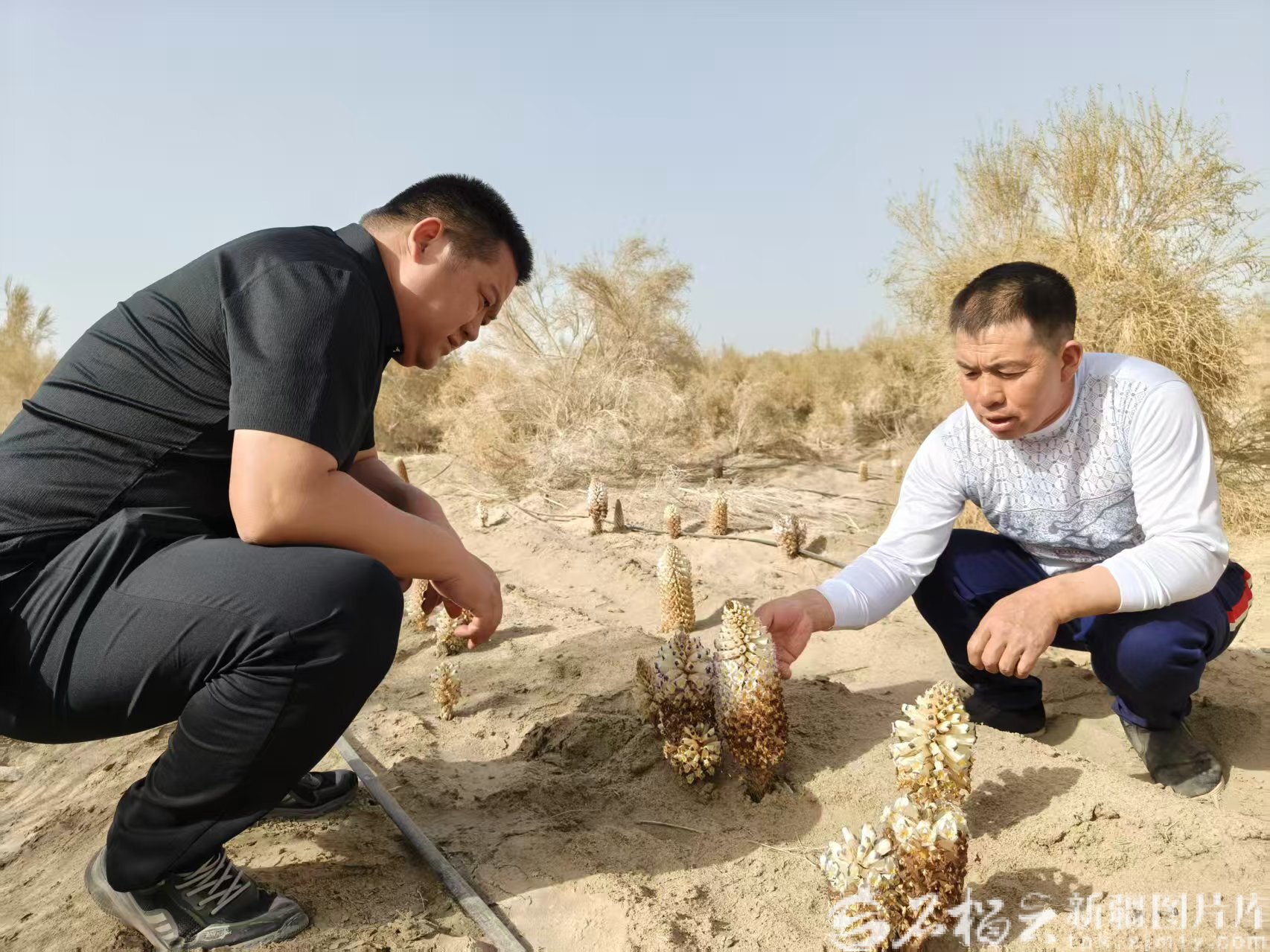 5月1日,沙雅县漠鑫开发有限公司工作人员(右)向当地干部介绍肉苁蓉开花情况。石榴云/新疆日报记者 张治立摄
