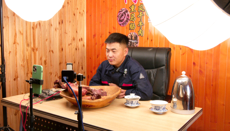 主播正在直播推介熏马肠。来源:特克斯零距离