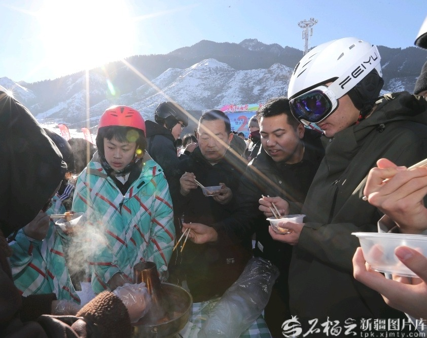 2024年12月7日,第22届乌鲁木齐丝绸之路冰雪风情节开幕式现场,游客在品尝雪地火锅(资料图)。