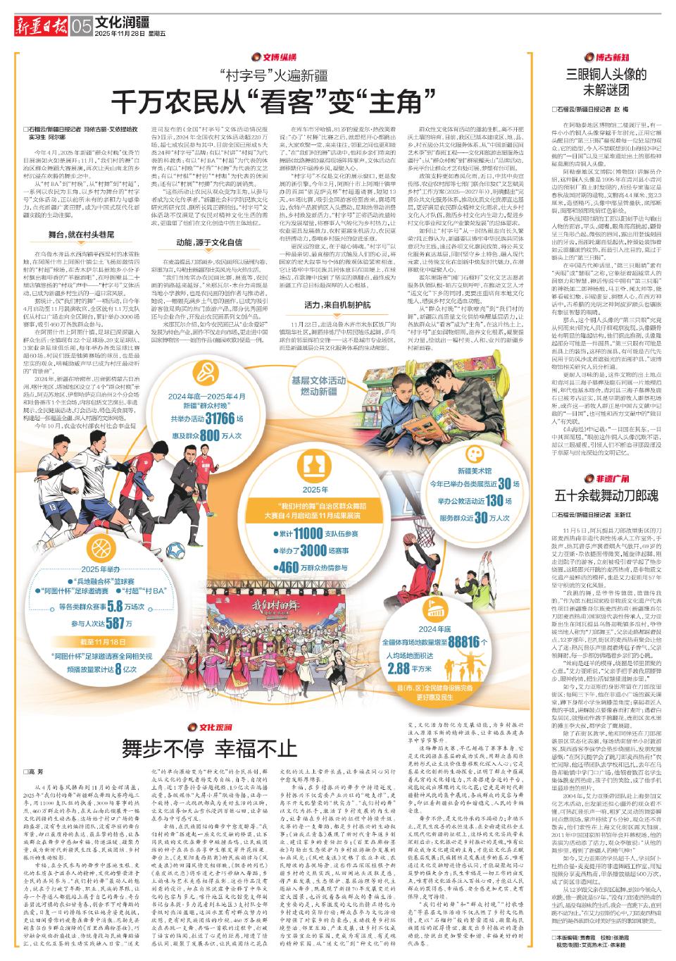 从“群众村晚”“村歌嘹亮”到“我们村的舞”,新疆以高质量文化供给唤醒基层活力,让各族群众从“看客”成为“主角”。在这片热土上,“村字号”正如润物细雨,滋养文化根系,凝聚振兴力量,绘就出一幅村美、人和、业兴的新疆乡村新画卷。