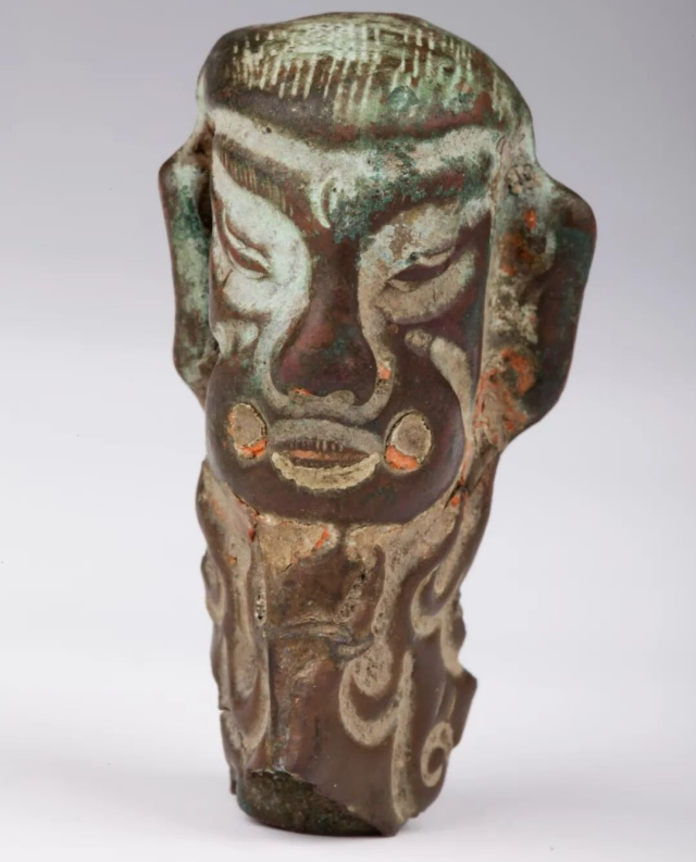 那么,这个铜人头像的“第三只眼”究竟从何而来?研究人员仔细观察发现,头像颧骨处有明显的隆起结构,他们据此推测,头像隆起部分可能是一件面具。“第三只眼有可能是面具上的装饰,这样的面具,有可能是古代先民用于防风沙或者遮强光的面部护具。”该博物馆相关研究人员分析道。